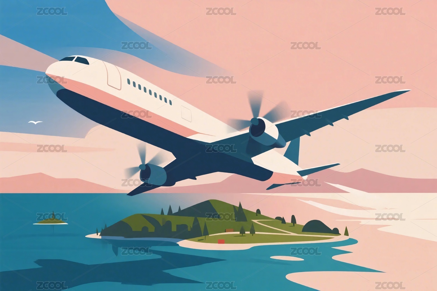 插画风格飞机飞越岛屿画面