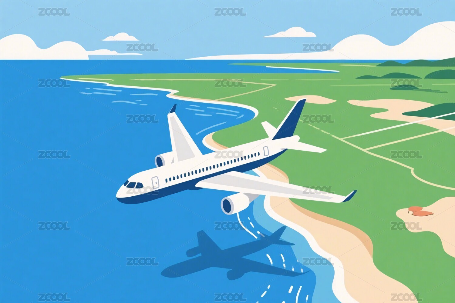 飞机飞越海岸风景插画