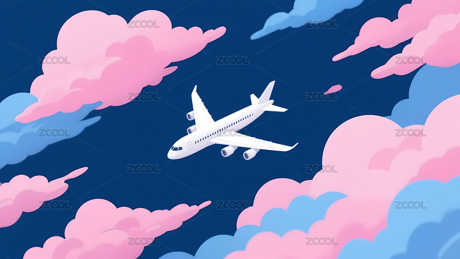 插画风格飞机在云端飞行