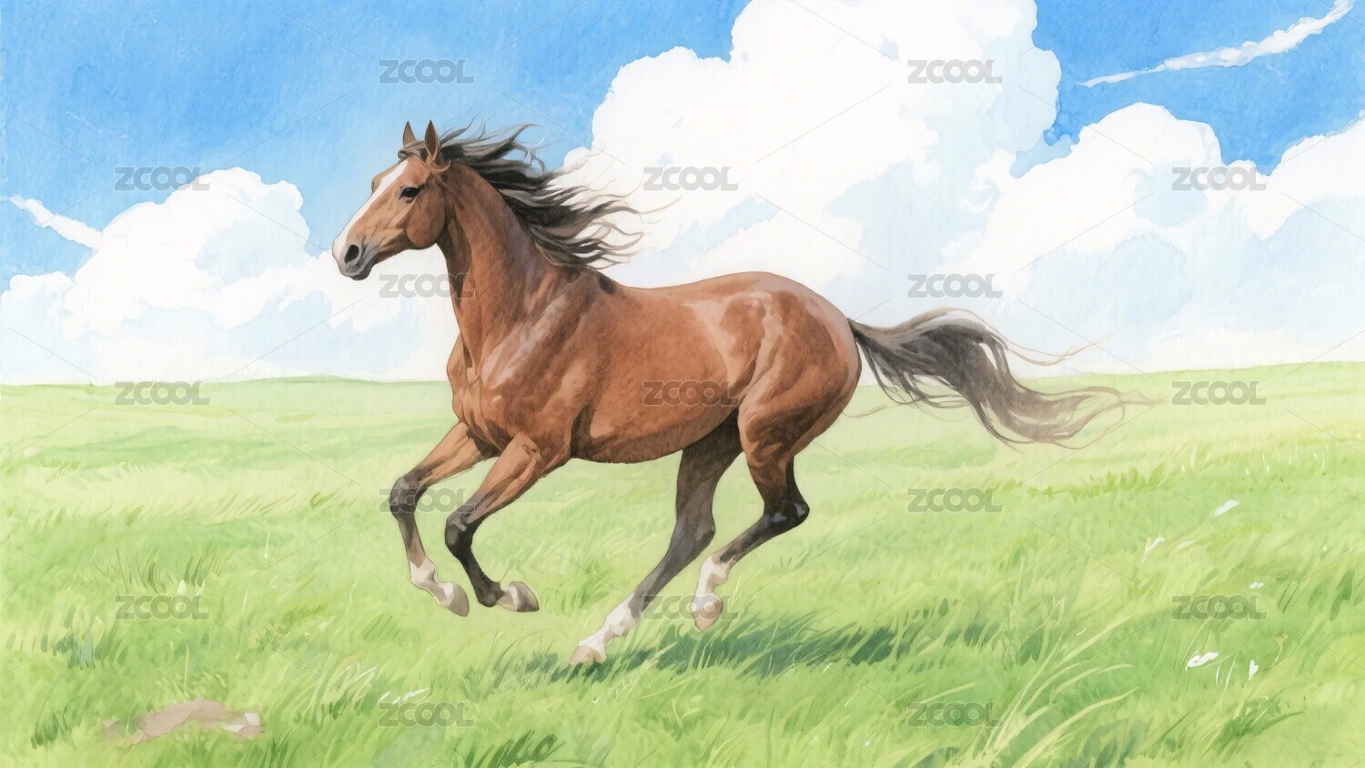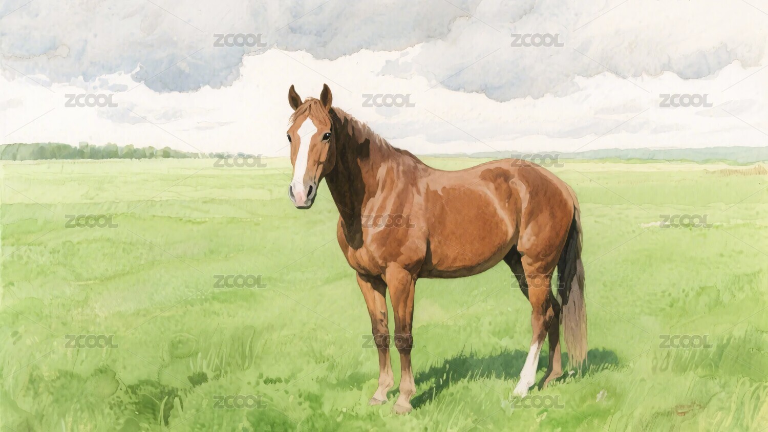 骏马,草原,湖泊,雪山,风景,自然,动物,草地,绘画,艺术