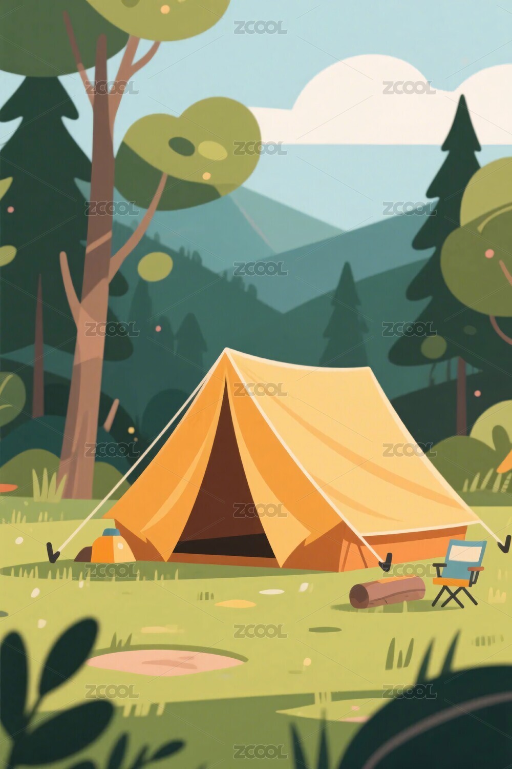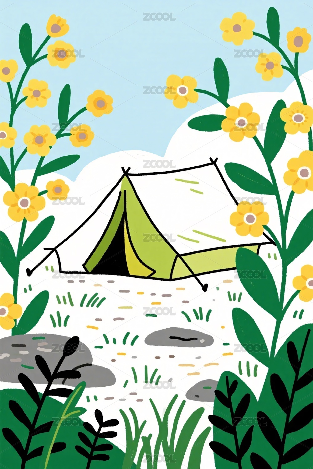 森林,帐篷,草地,花朵,树木,夜晚,插画,卡通,矢量,自然