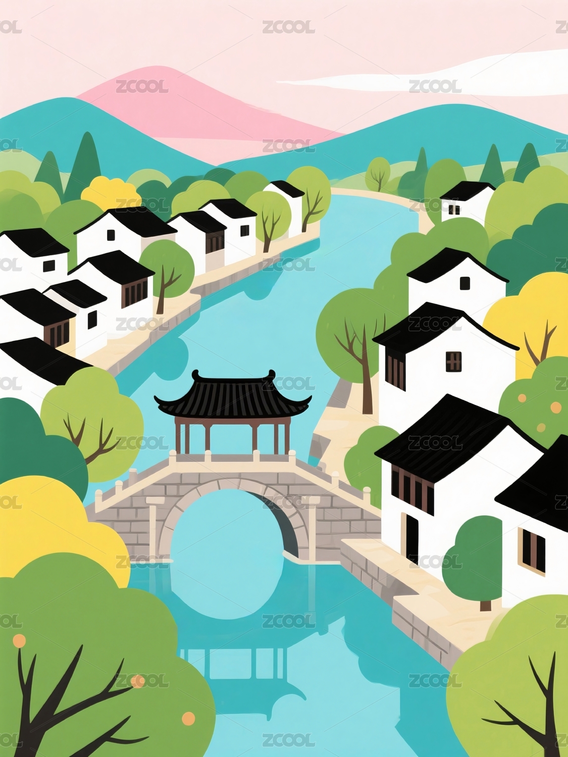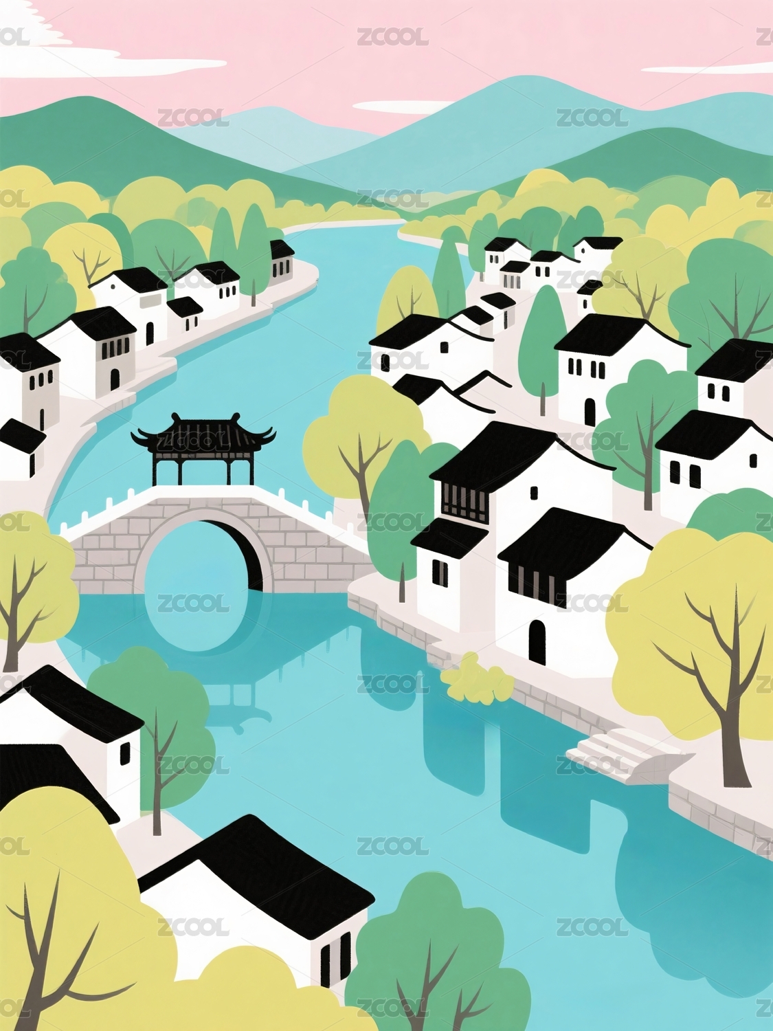 中式山水村落插画风景