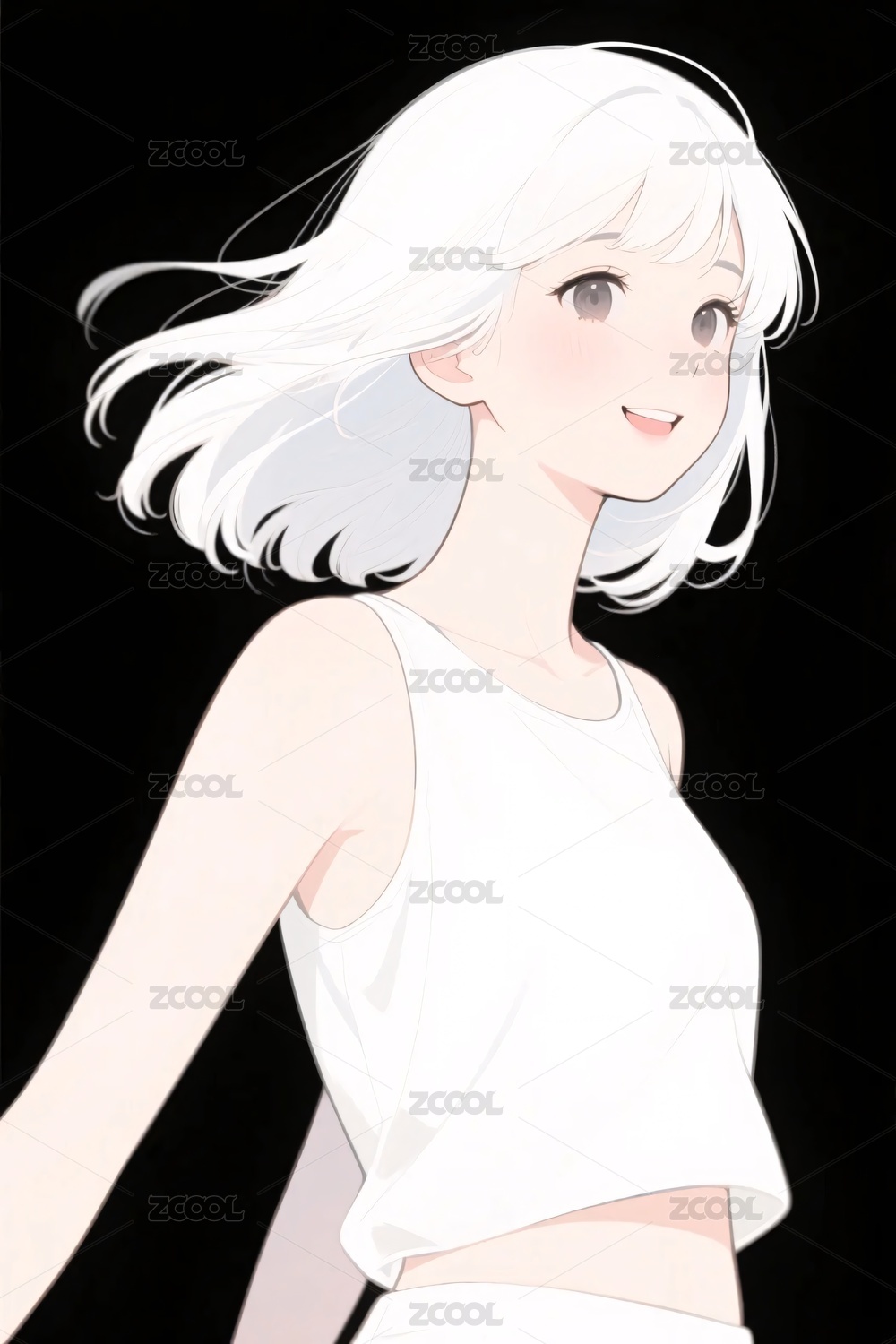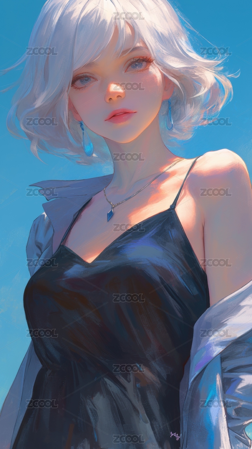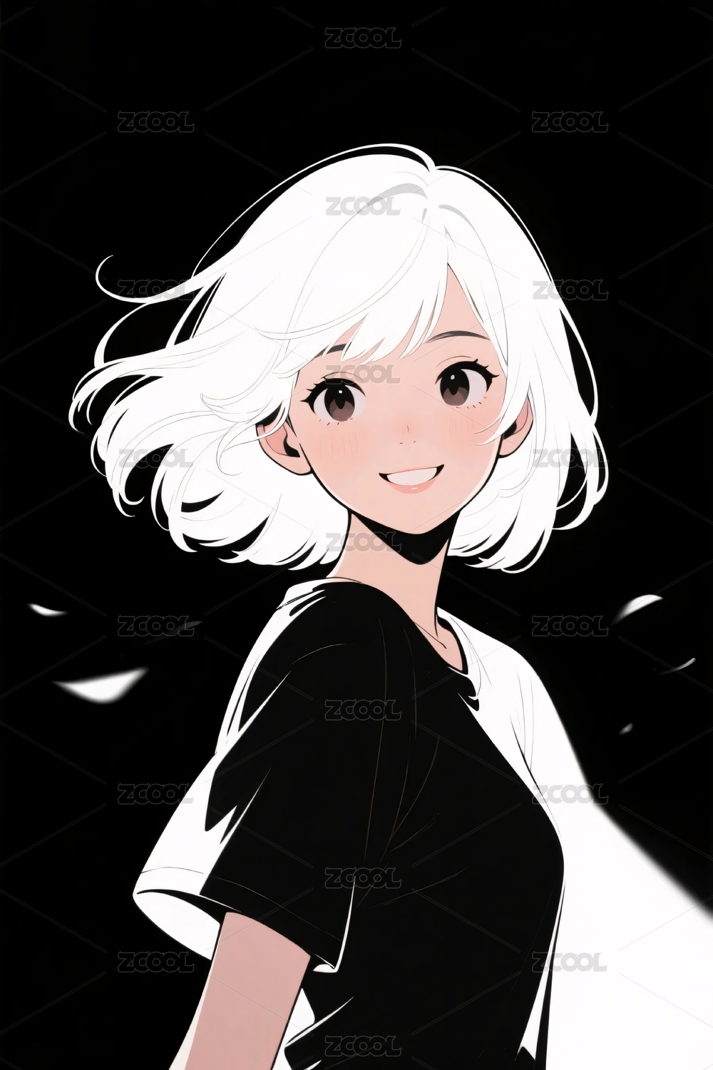 白发,插画,人物,动漫,女性,黑衣,短发,艺术,矢量,卡通