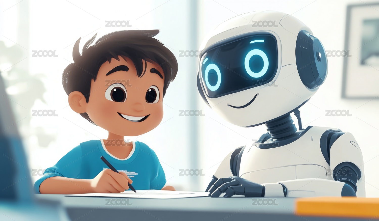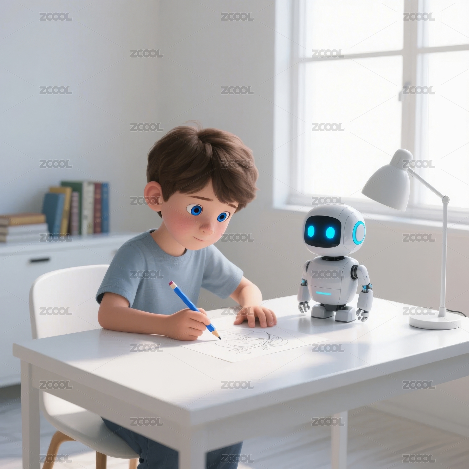 现代,室内,明亮,男孩,机器人,学习,书桌,书写,温馨,科技
