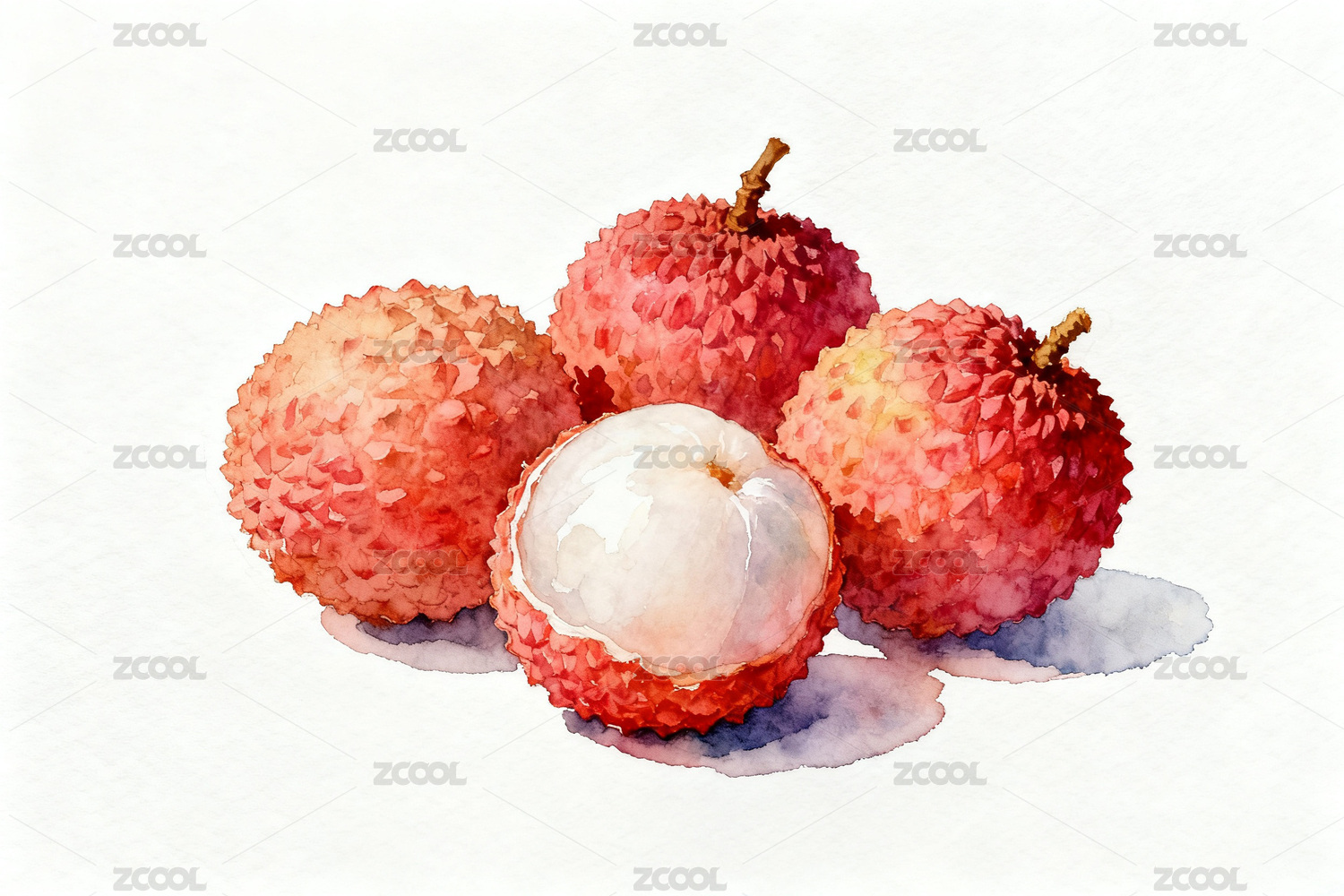 水彩风格清新带枝叶的荔枝水果艺术插画