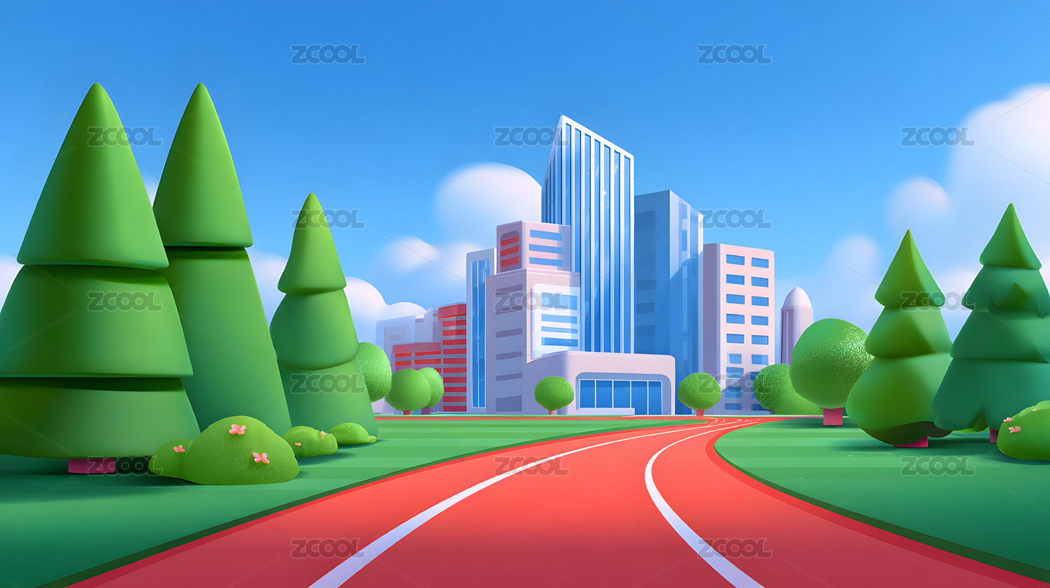 云,天空,城市,建筑,高楼,跑道,树木,草地,运动场,绿树