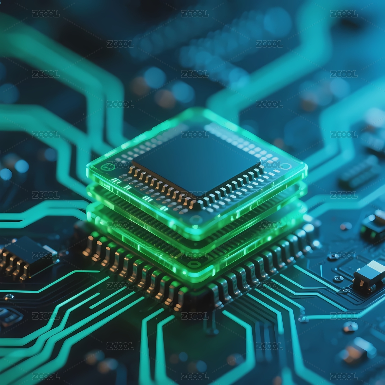 绿色电路板上的多层芯片