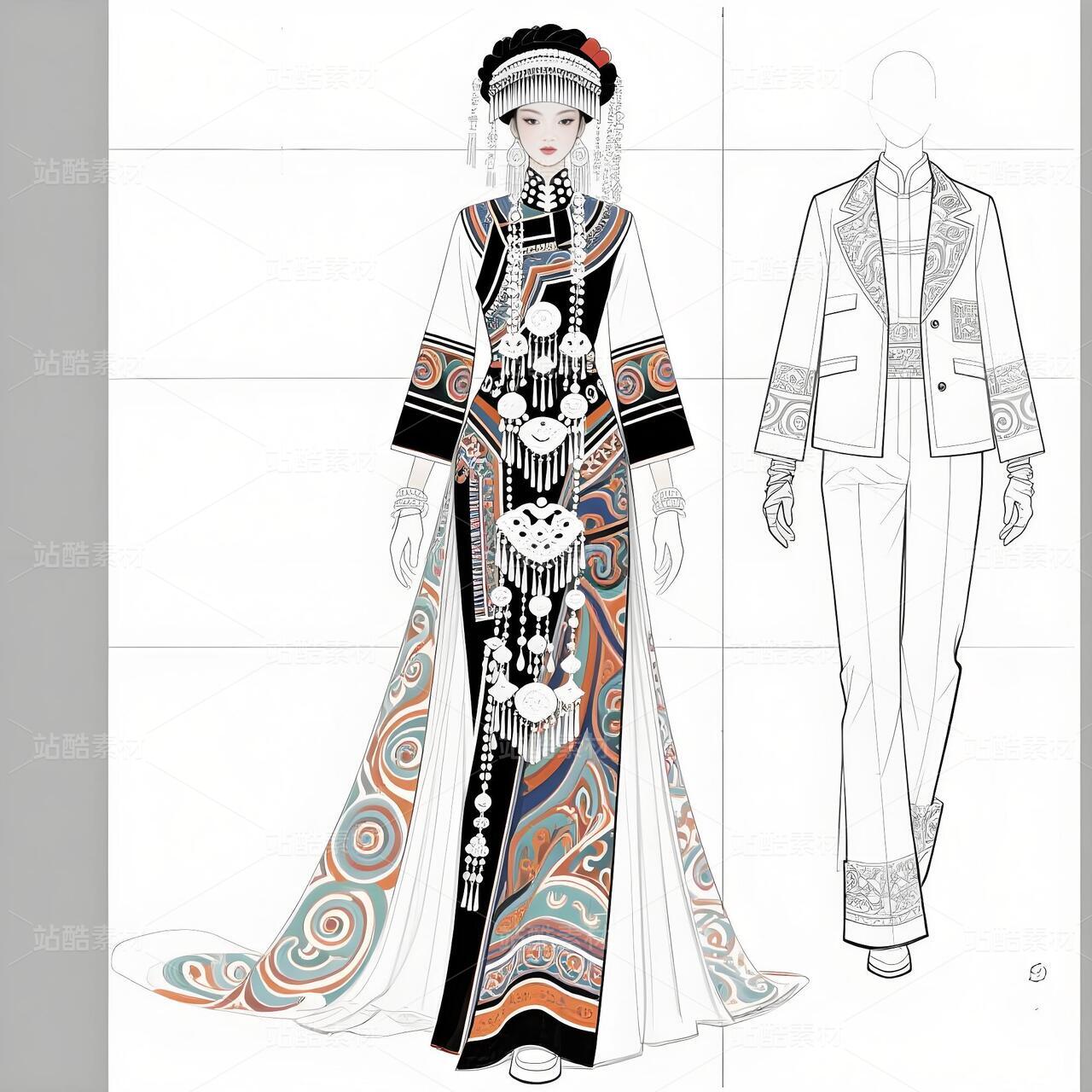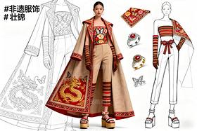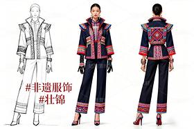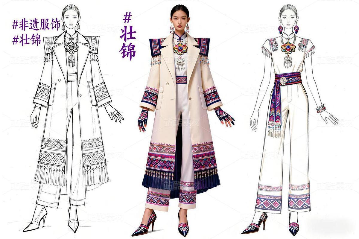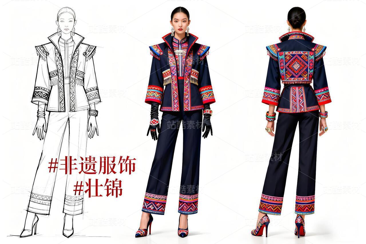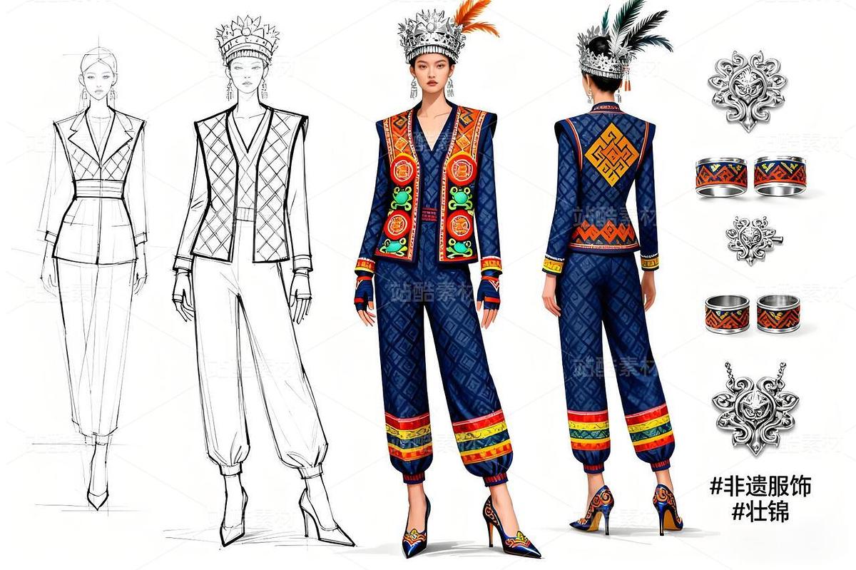 此系列将非遗壮锦与现代时装完美融合,设计师提取壮族“万寿纹”“太阳纹”等古老图腾,通过创新针法将传统纹样织入西装面料。外套采用不对称壮锦拼接设计,裤装侧缝嵌入金银丝线编织的带状装饰,手套背部巧绣缩 mini 版几何壮锦图案。整体既保留民族手工艺的厚重感,又通过利落剪裁赋予高定时装未来主义锋芒,展现民族文化在当代时尚中的再生力量。银饰部件均与广西民间工匠合作打造,践行非遗活态传承。