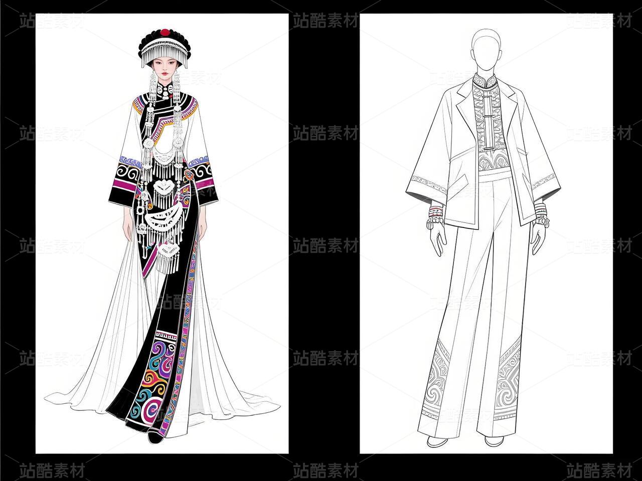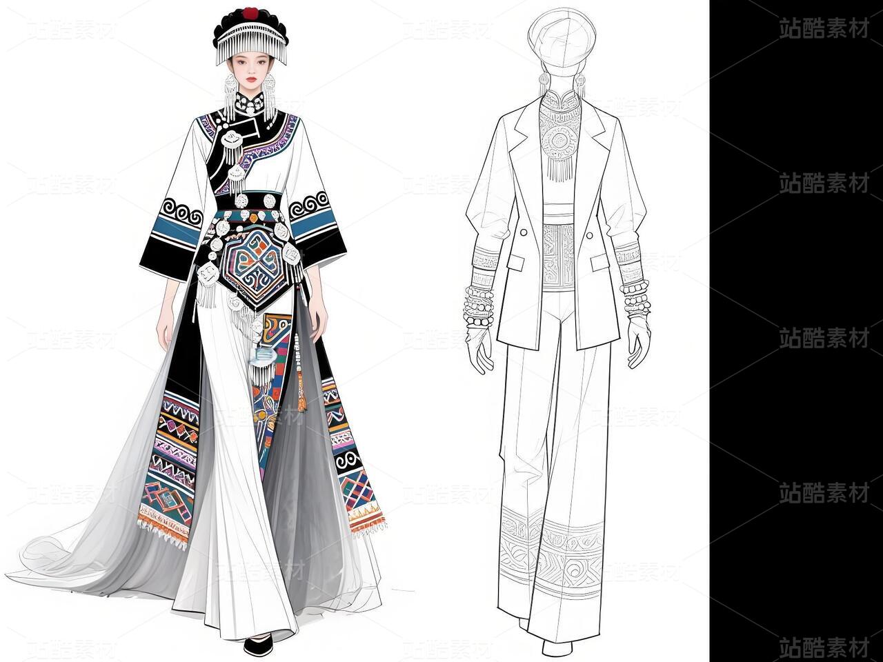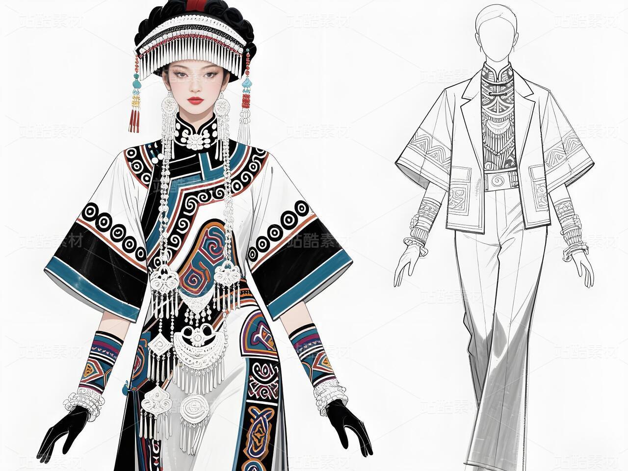 此系列将非遗壮锦与现代时装完美融合,设计师提取壮族“万寿纹”“太阳纹”等古老图腾,通过创新针法将传统纹样织入西装面料。外套采用不对称壮锦拼接设计,裤装侧缝嵌入金银丝线编织的带状装饰,手套背部巧绣缩 mini 版几何壮锦图案。整体既保留民族手工艺的厚重感,又通过利落剪裁赋予高定时装未来主义锋芒,展现民族文化在当代时尚中的再生力量。银饰部件均与广西民间工匠合作打造,践行非遗活态传承。