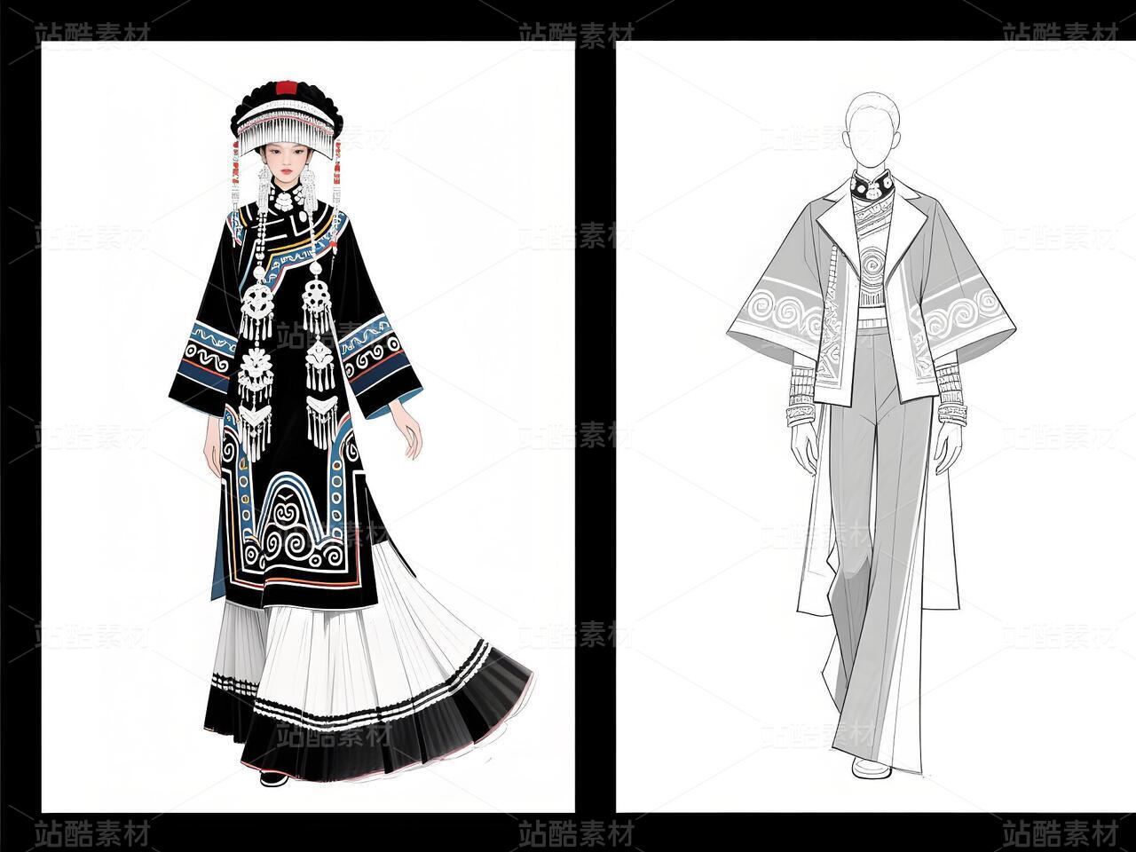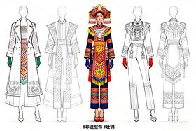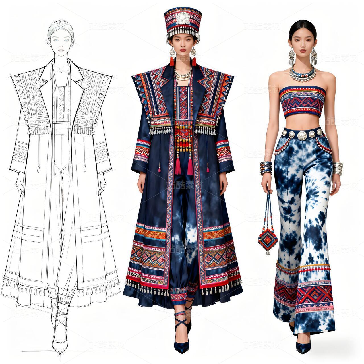 色彩体系:以扎染的不同明度浅蓝色为基底,壮锦装饰采用银线、白线、浅金线织就,配饰为做旧哑光银,营造高级静谧的视觉感受。