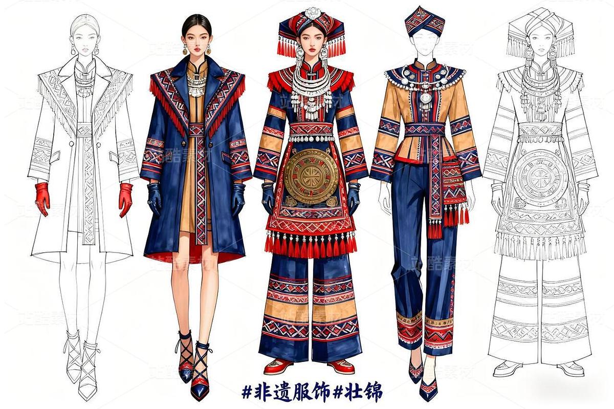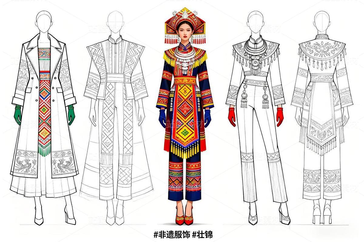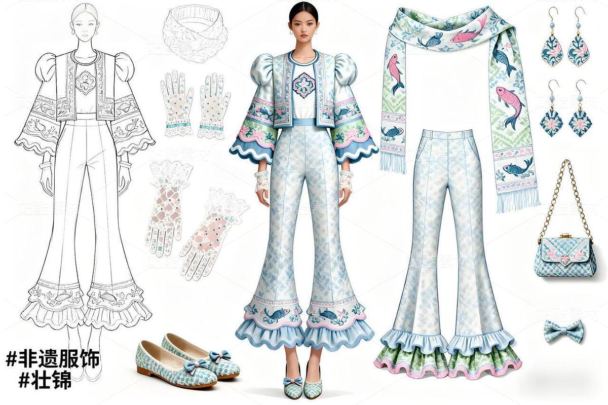 核心技艺:浅蓝扎染(模拟桂林山水意境)+ 壮锦纹样(太阳纹、云雷纹、鸟兽纹)