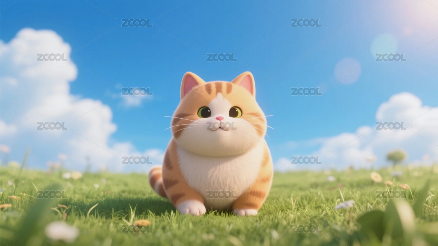 白天晴天绿色原野尖耳朵猫3D立体卡通插画
