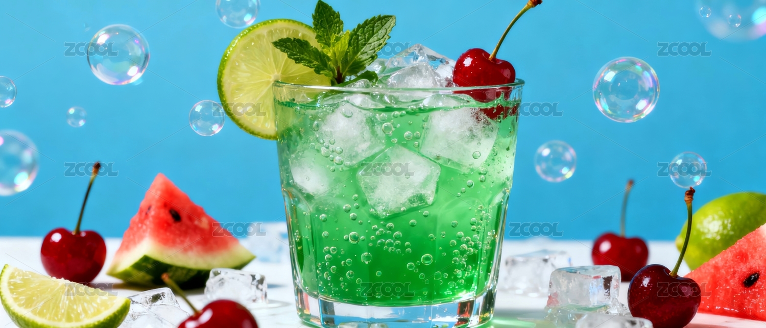 主视觉,商业,壁纸,饮品,绿色,清新,美食,场景,青柠,樱桃