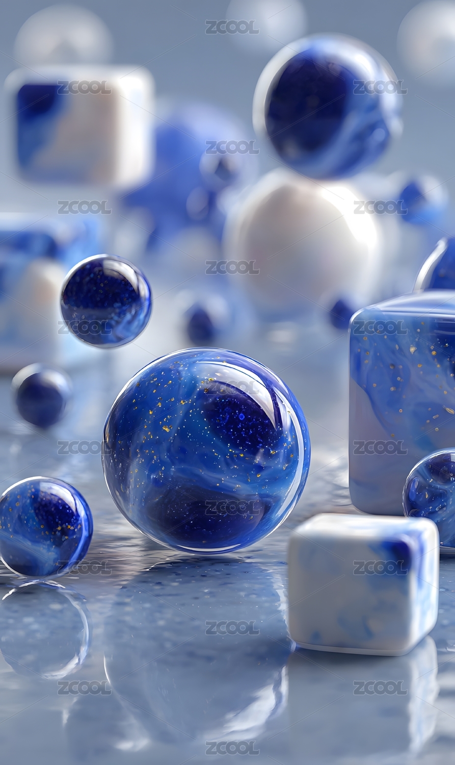 蓝色弹珠悬浮冰立方清爽意境