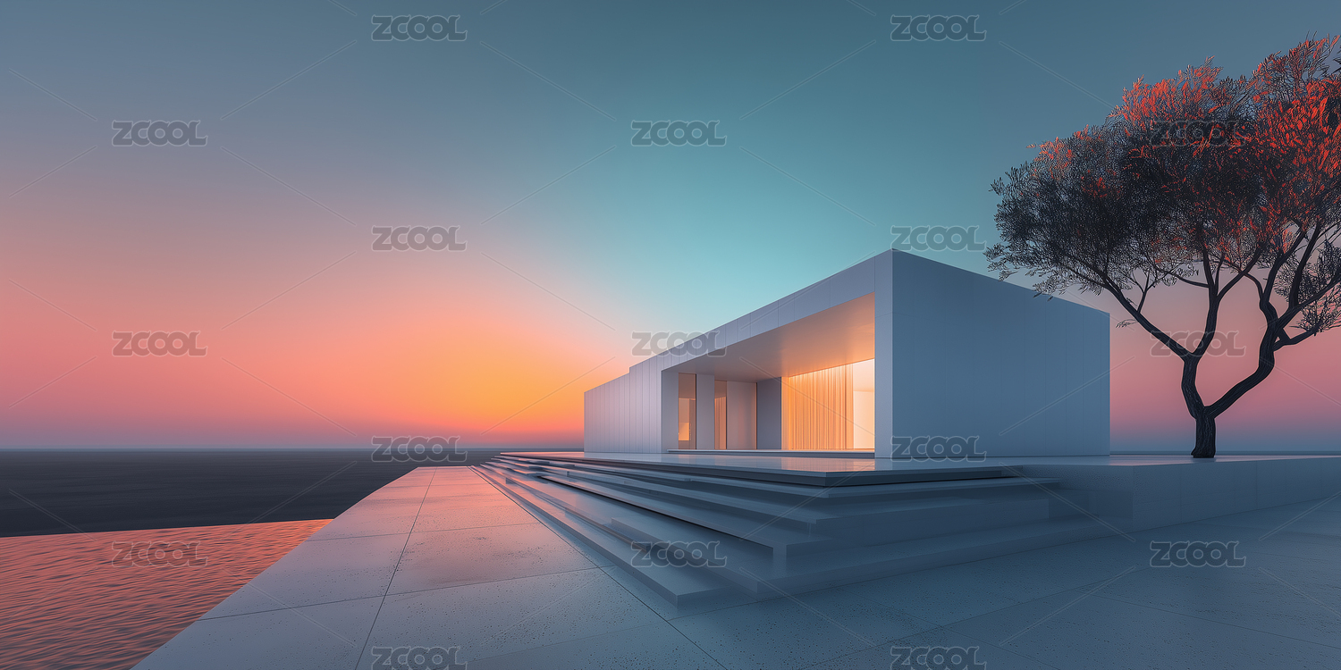 未来极简金属白墙日落房