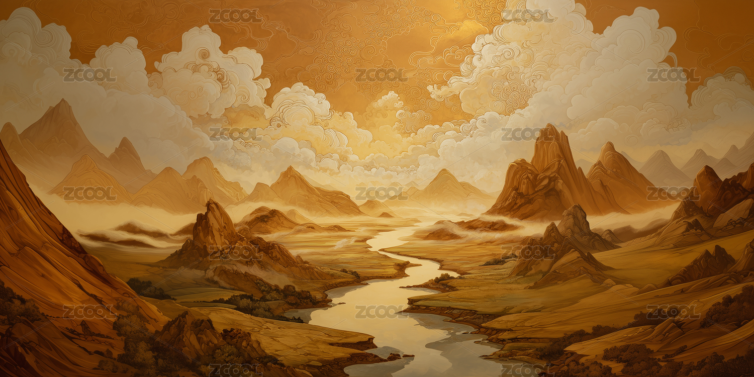 金色山水流河远雾