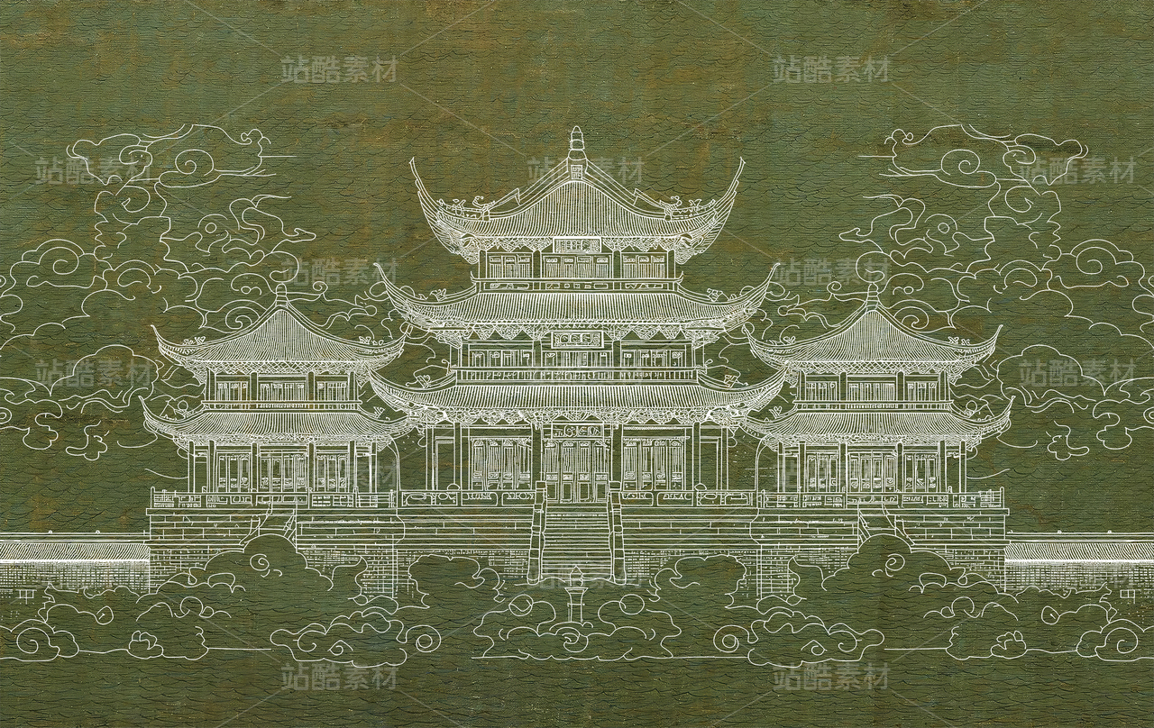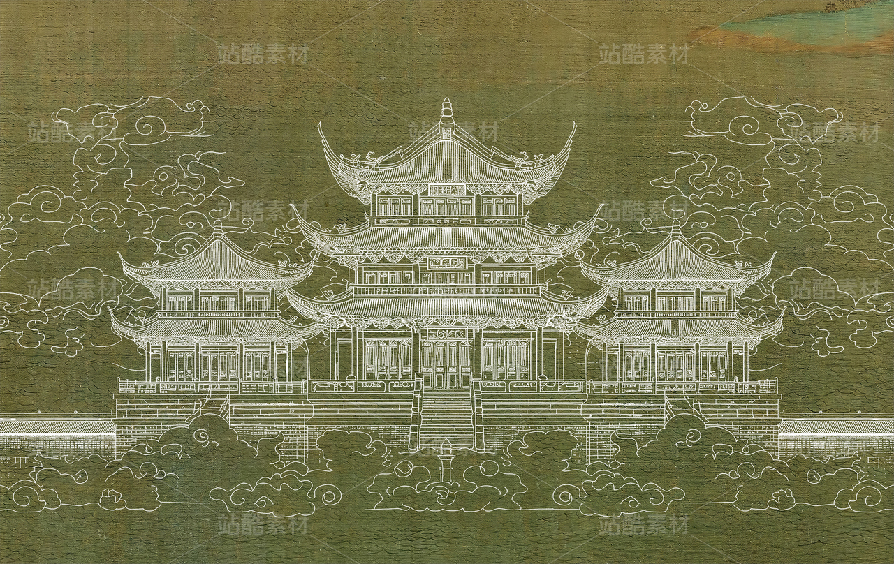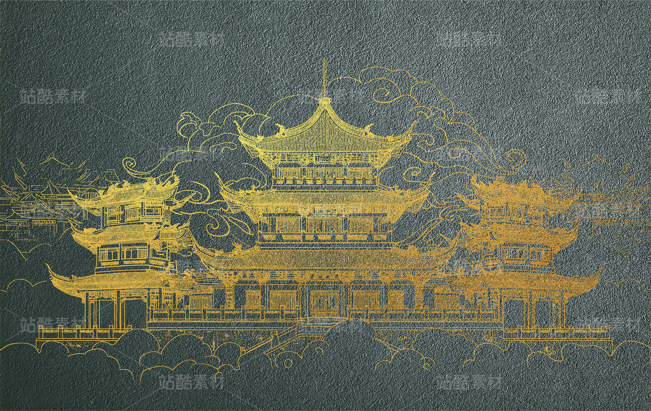 新中式国风亭台楼阁建筑工装背景墙壁画