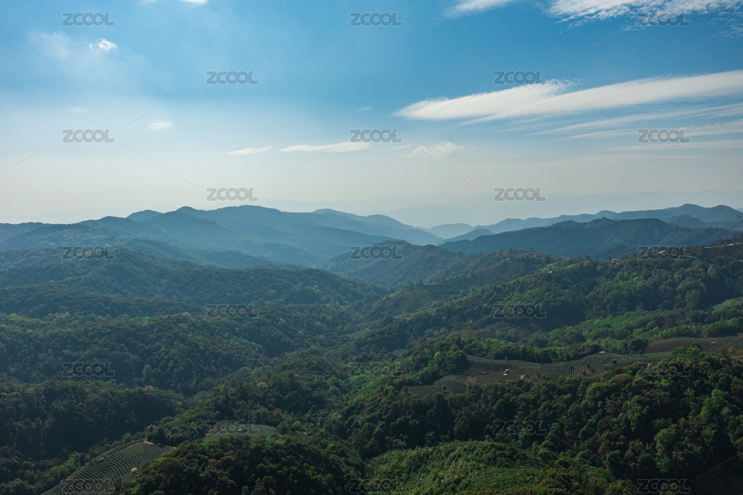 暴风雨天空下郁郁葱葱的森林的山景主题