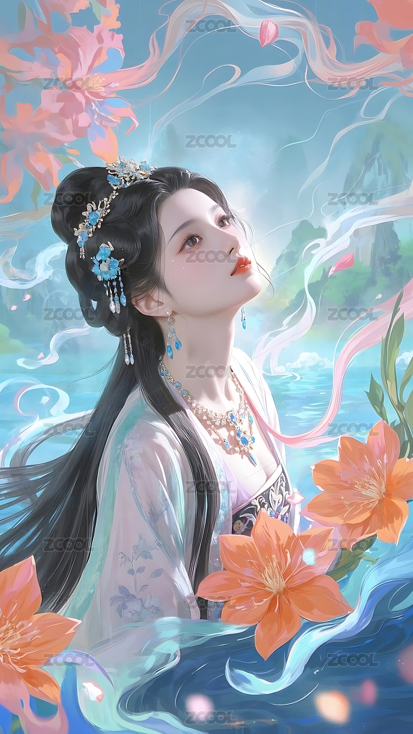 古典美人仰望天空,梦幻水彩风格