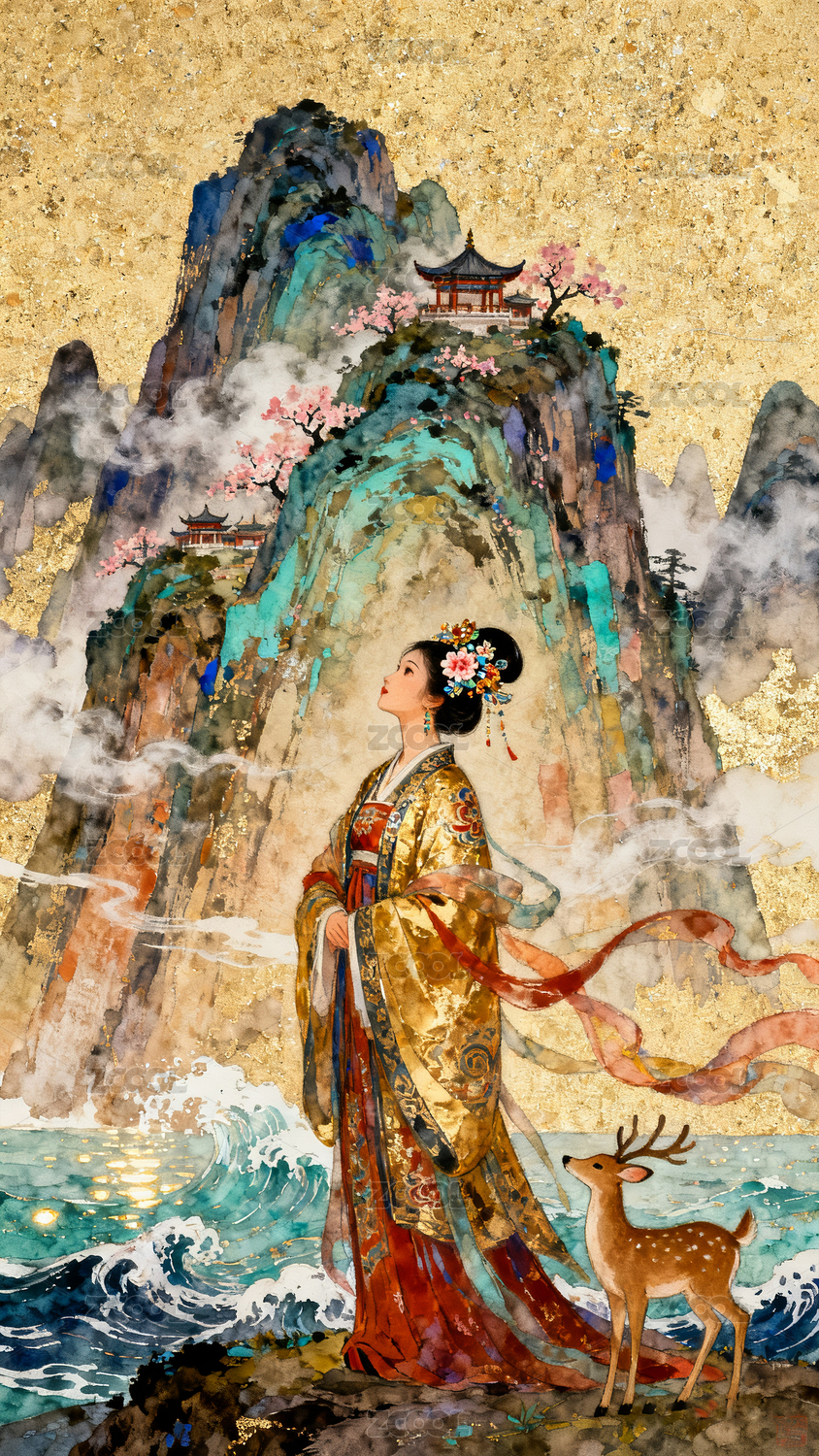 金色华服女子梦幻写意图