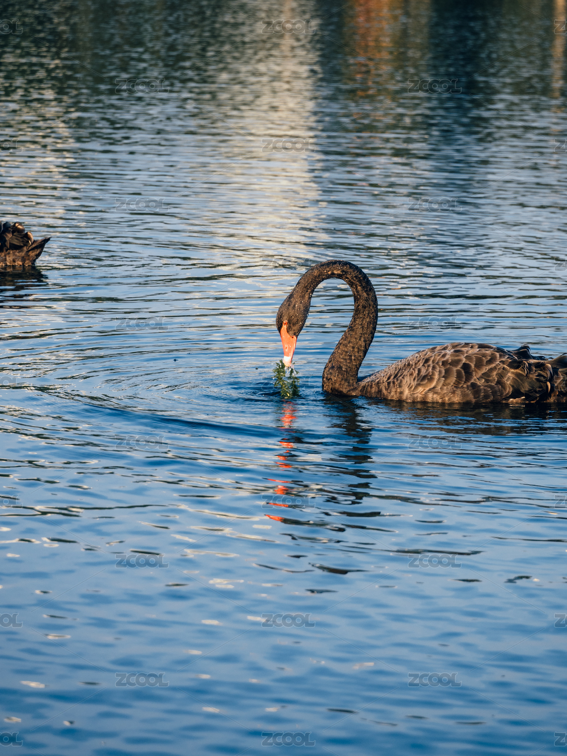波光粼粼的湖面上游泳觅食的黑天鹅