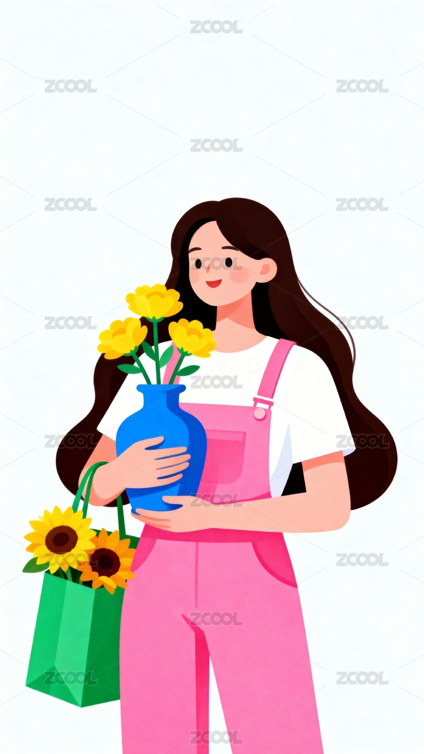 女孩手持花瓶和花袋