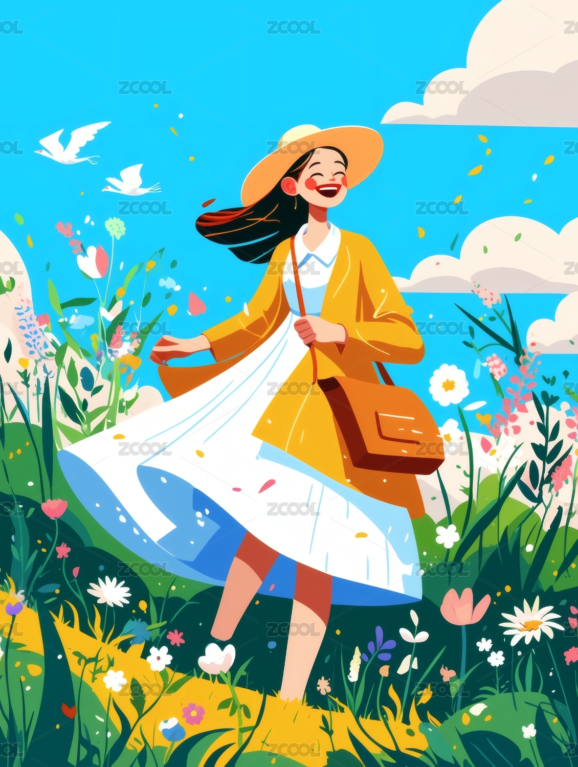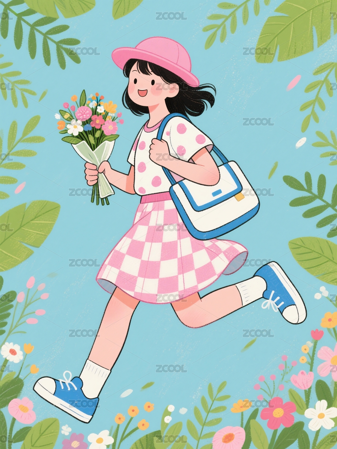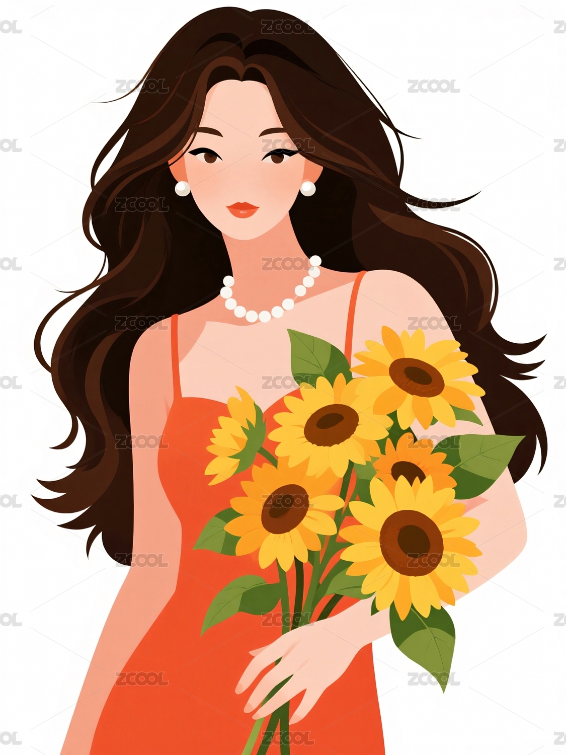 抱着一束花的女孩插画