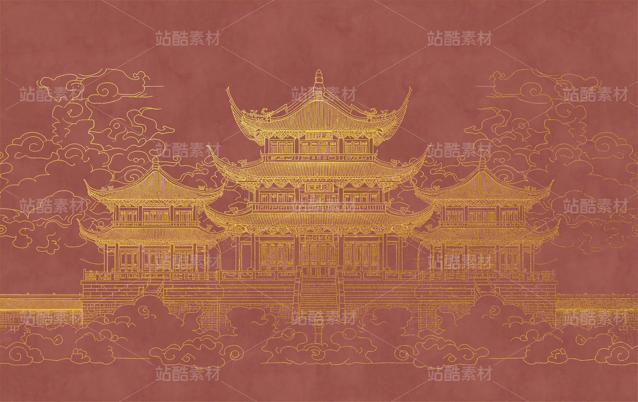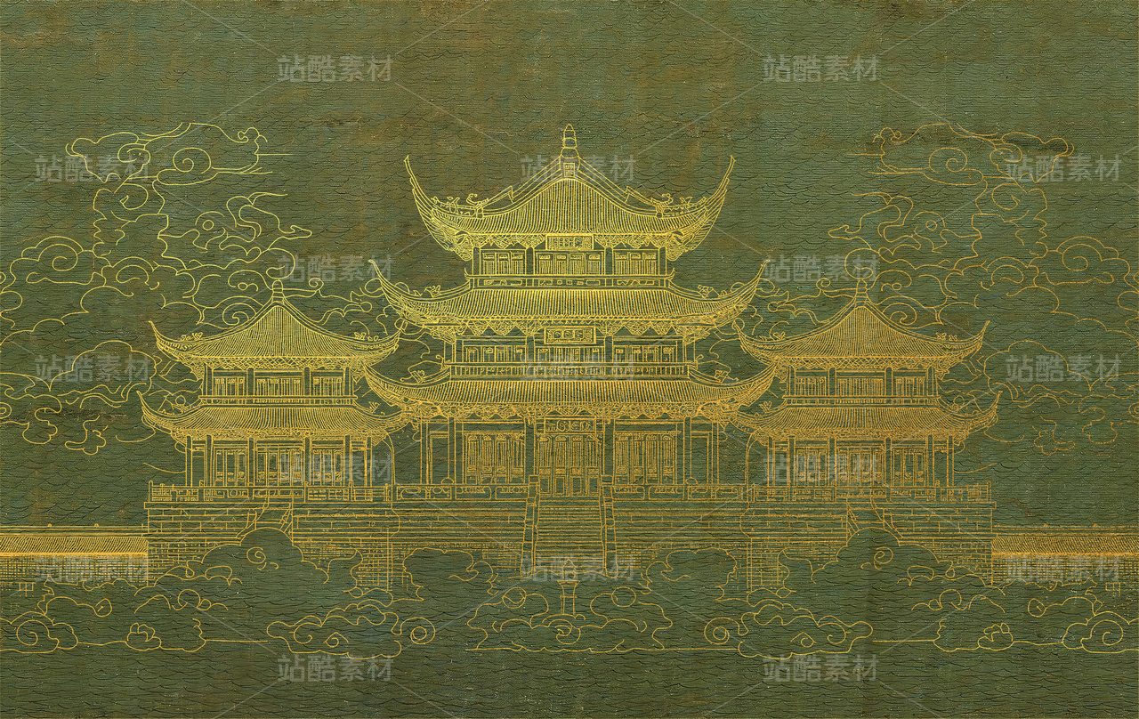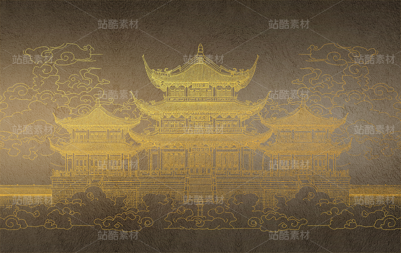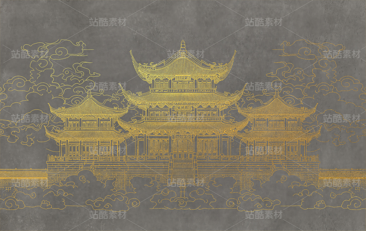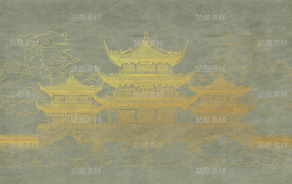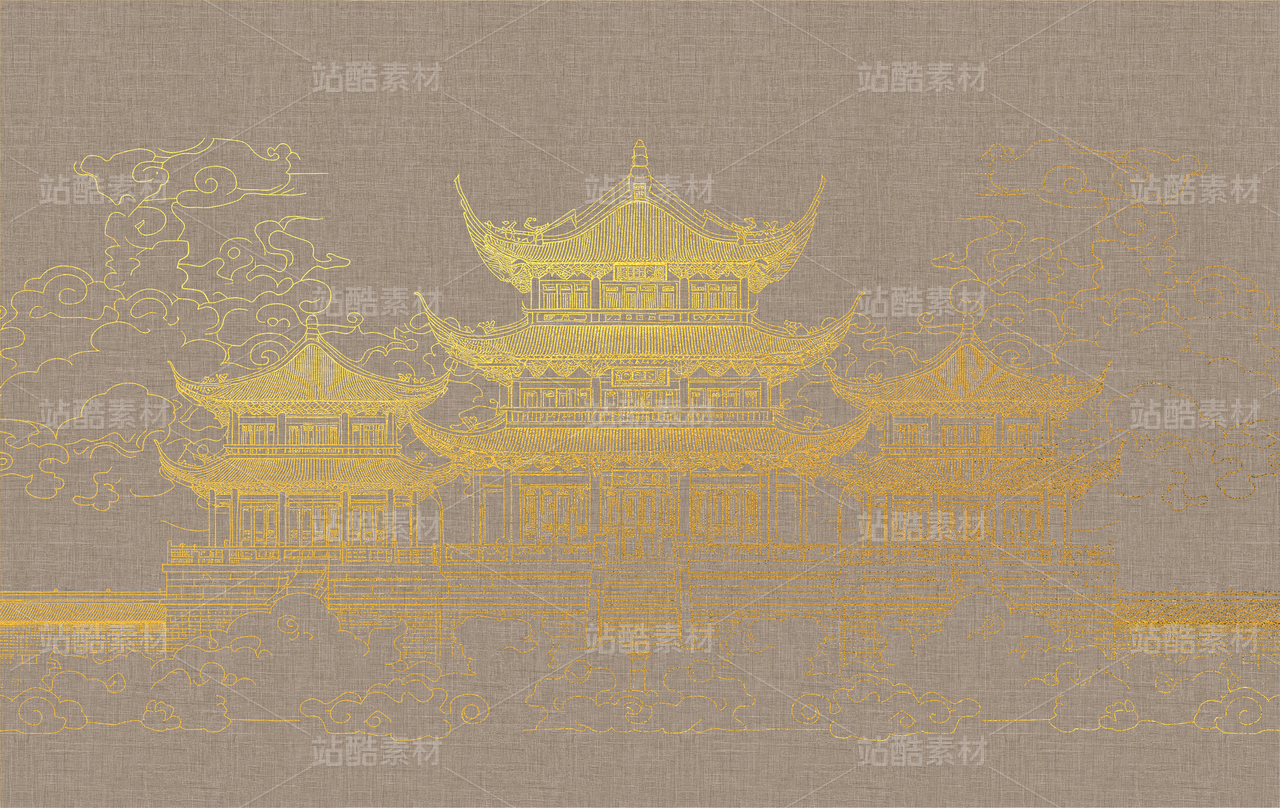 新中式国风亭台楼阁建筑工装背景墙壁画