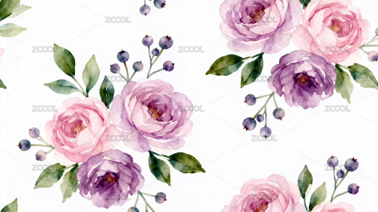 红紫玫瑰水彩花卉图案