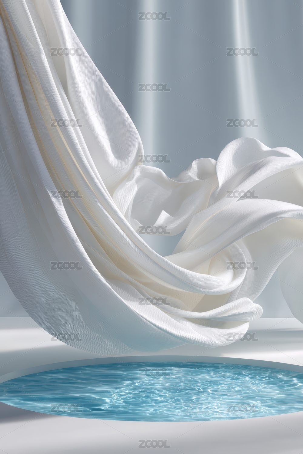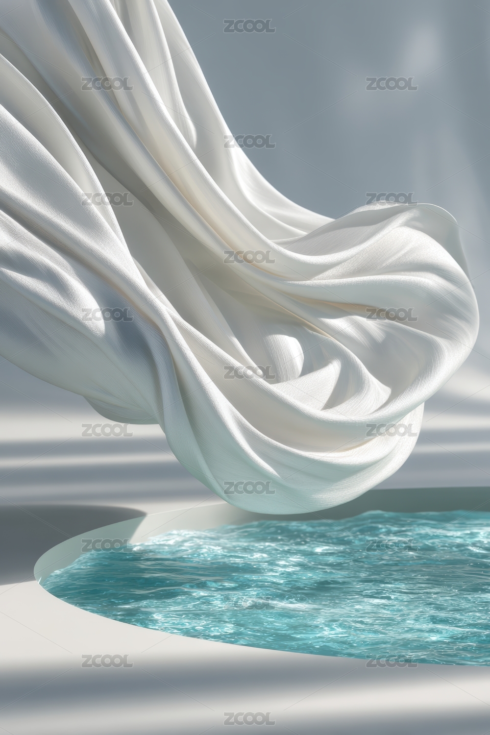 飘逸的白色布料与碧蓝水面的梦幻交织