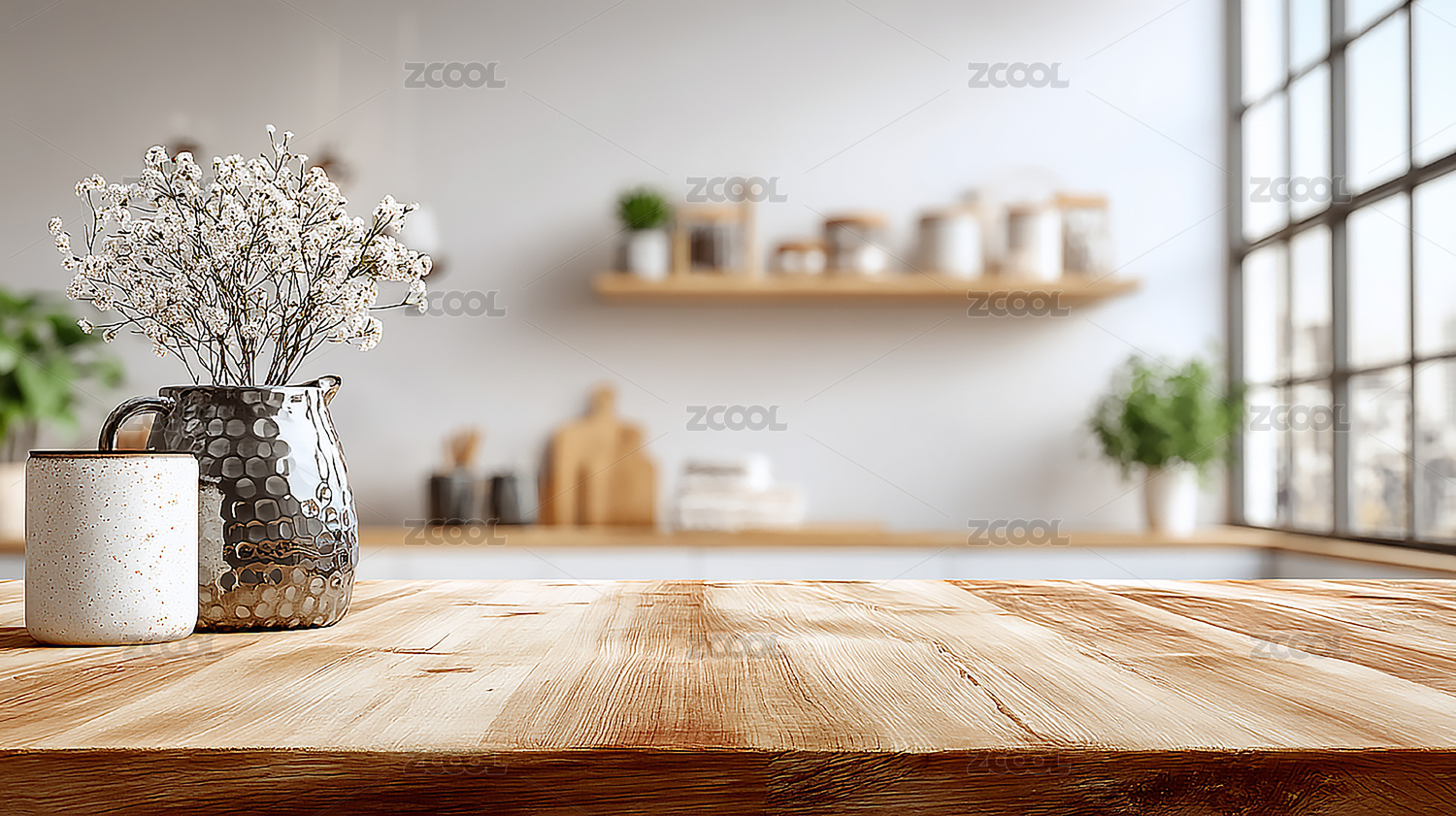 厨房,桌子,木质,白色,台面,装饰,花瓶,餐具,杯子,现代