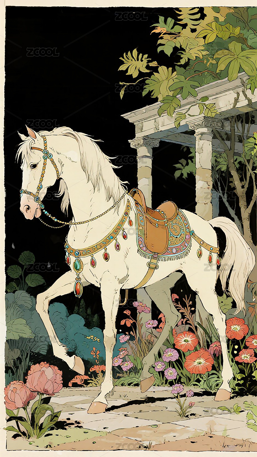 白马,站立,镜前,椭圆,金框,雕花,华丽,墙纸,暖黄,镜面