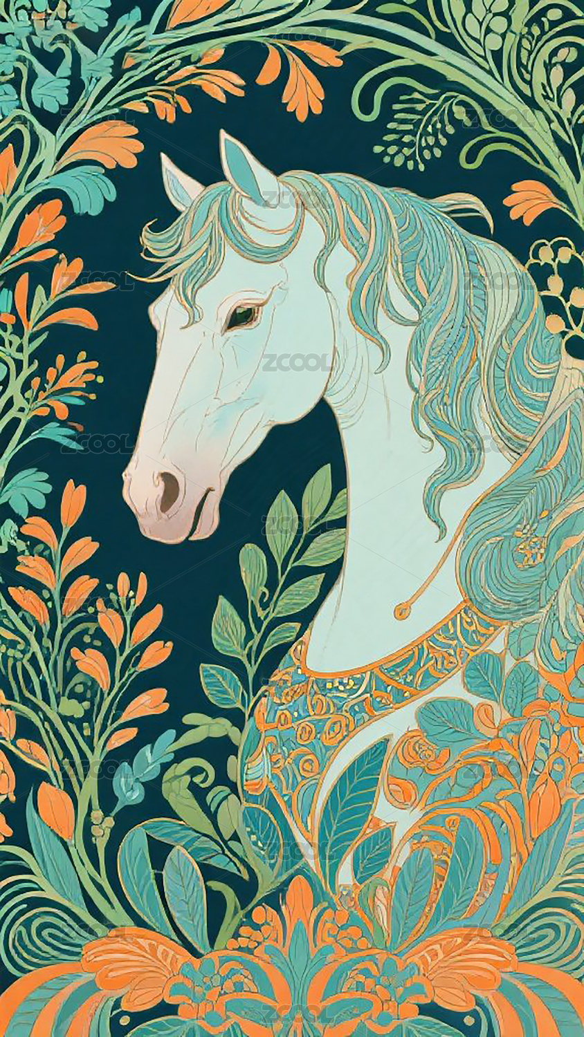 奇幻花卉环绕的蓝绿鬃毛装饰白马插画