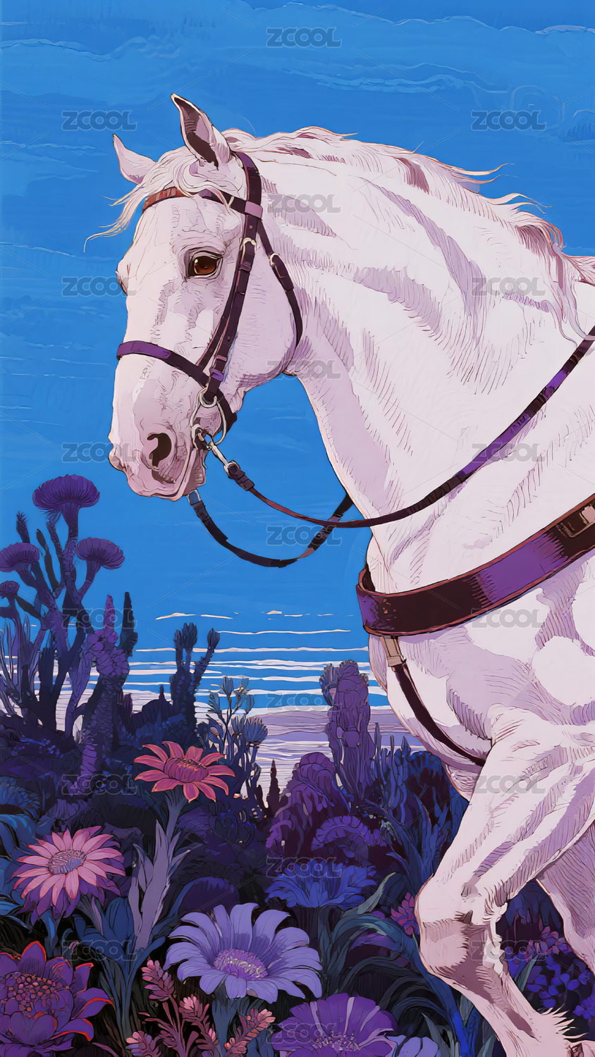 花丛中的白马插画