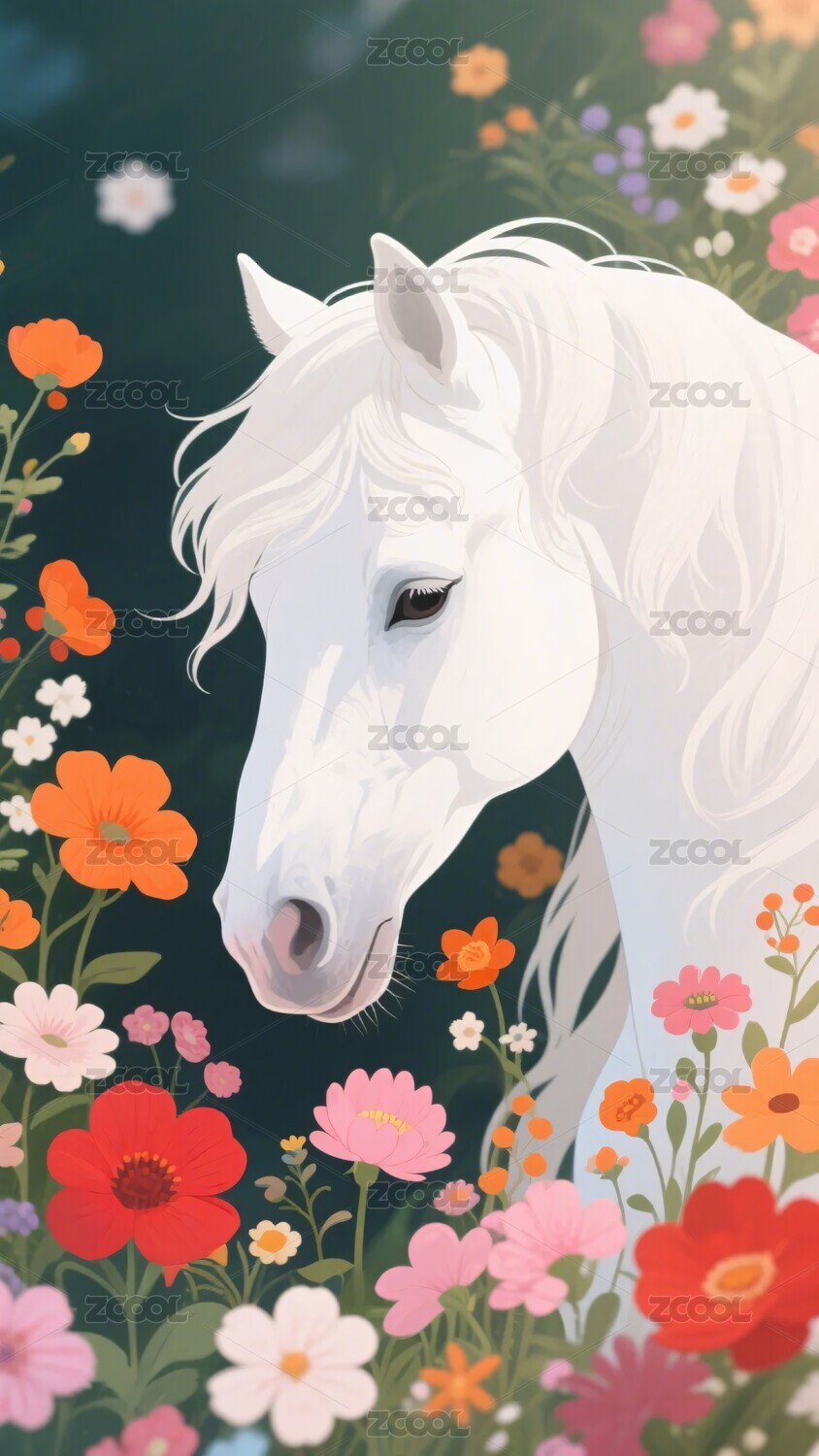 花丛中的白色骏马插画