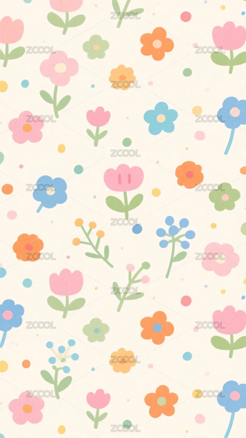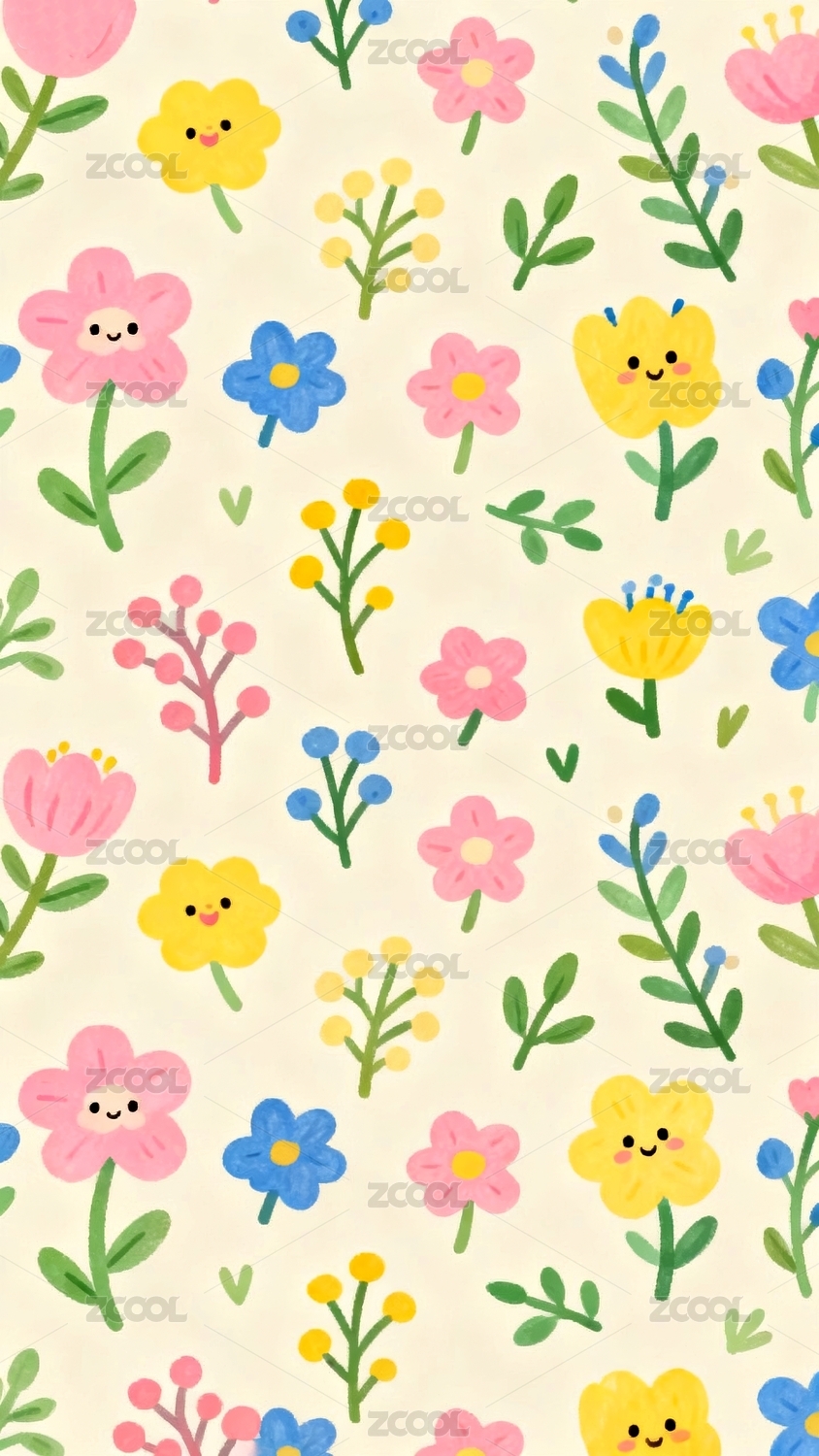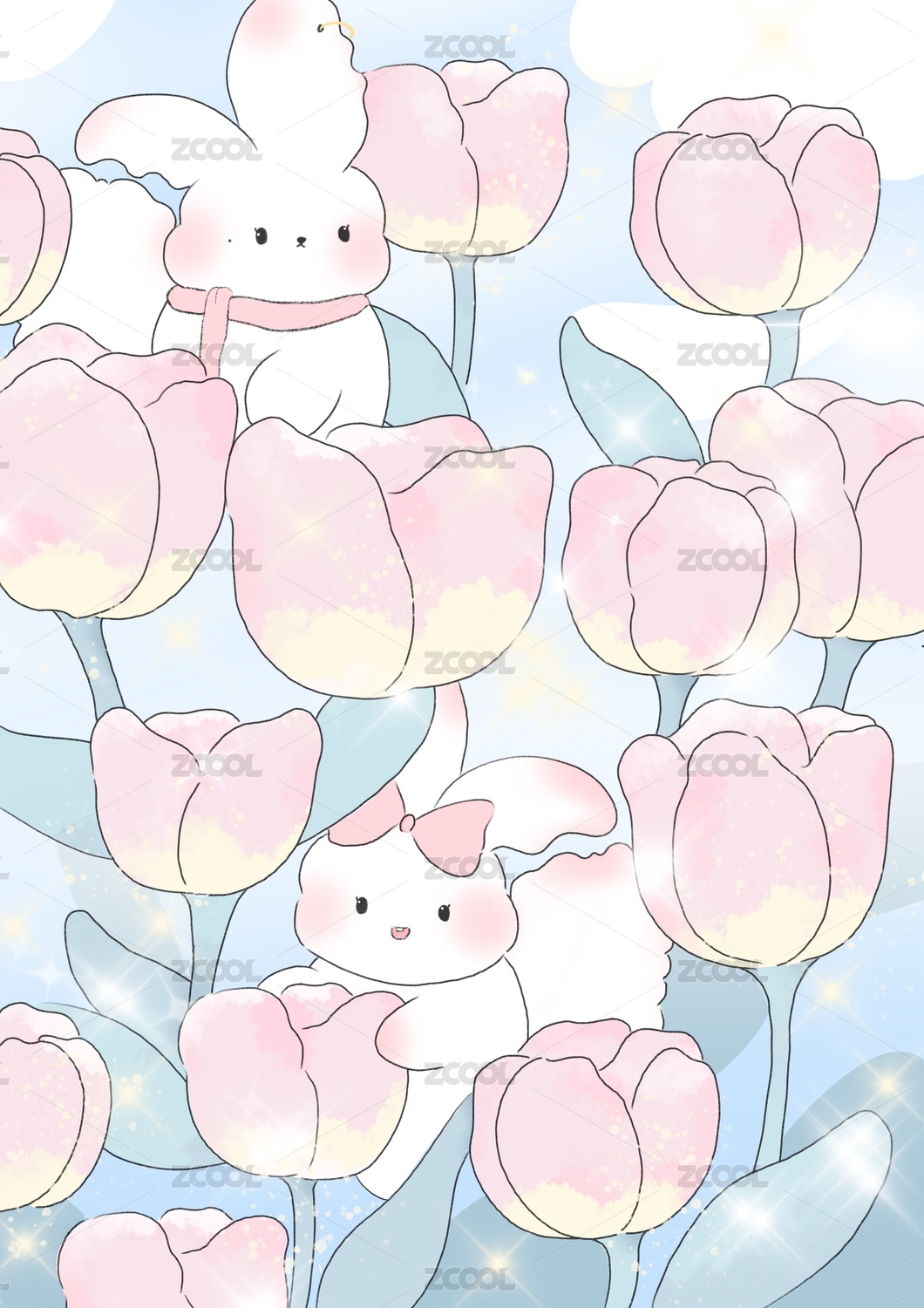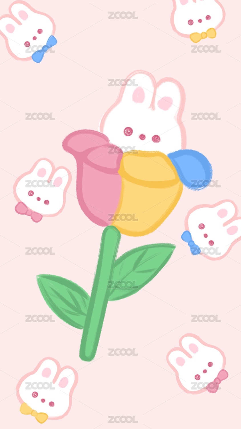 郁金香花朵可爱卡通小熊手机壁纸插画