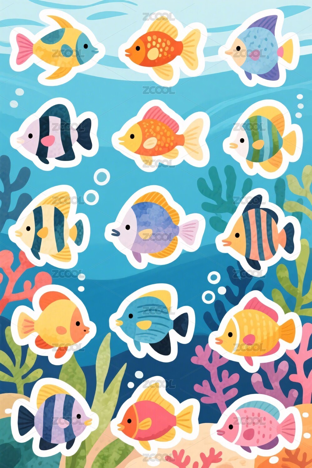 鱼类,水草,海洋,插画,卡通,热带鱼,水生植物,色彩丰富,装饰画,海洋世界