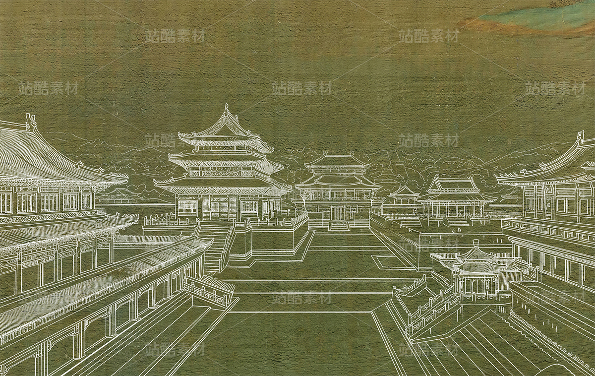 新中式国风亭台楼阁建筑工装背景墙壁画