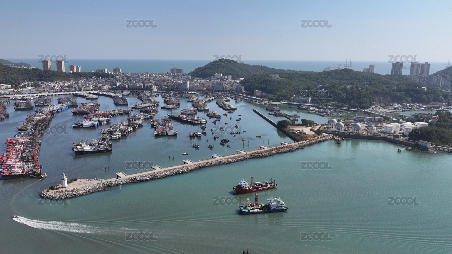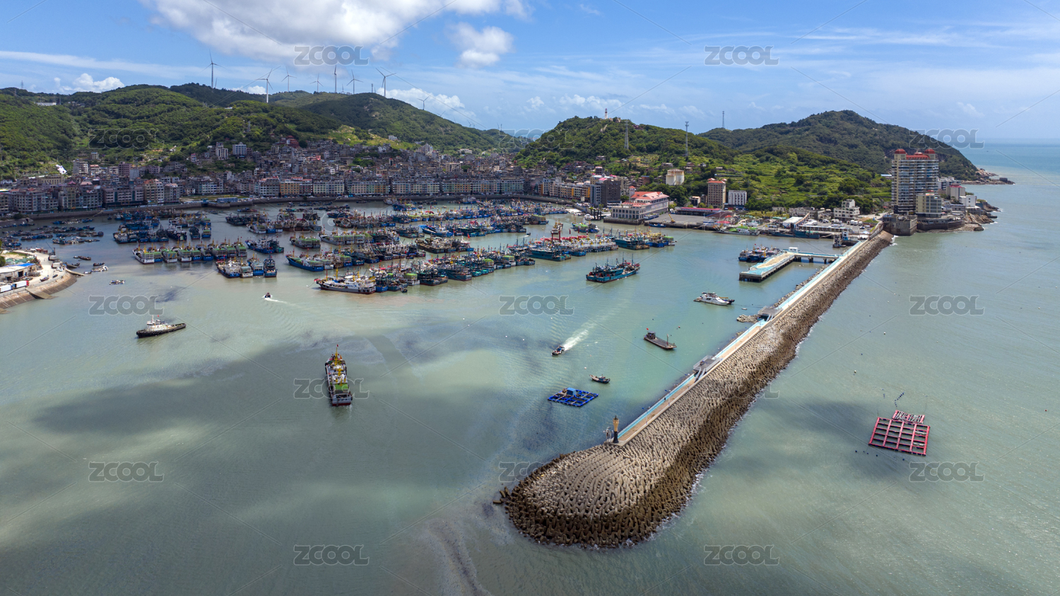 宁波石浦港航拍,停泊在港湾里的渔船