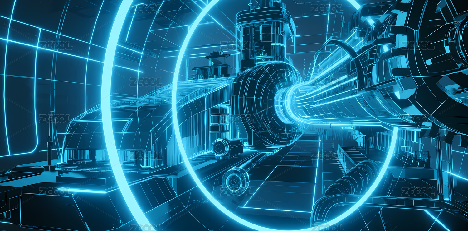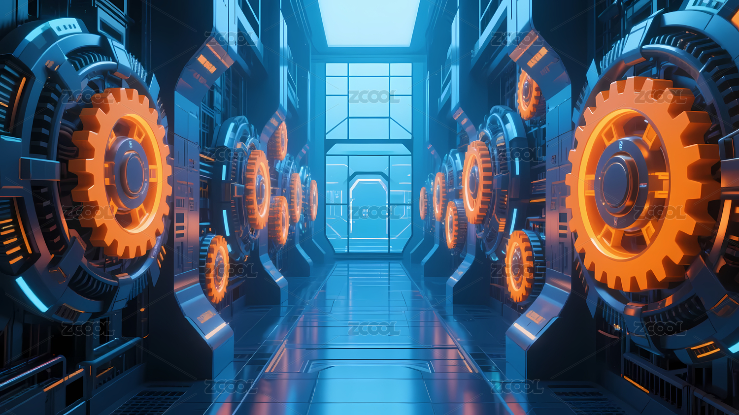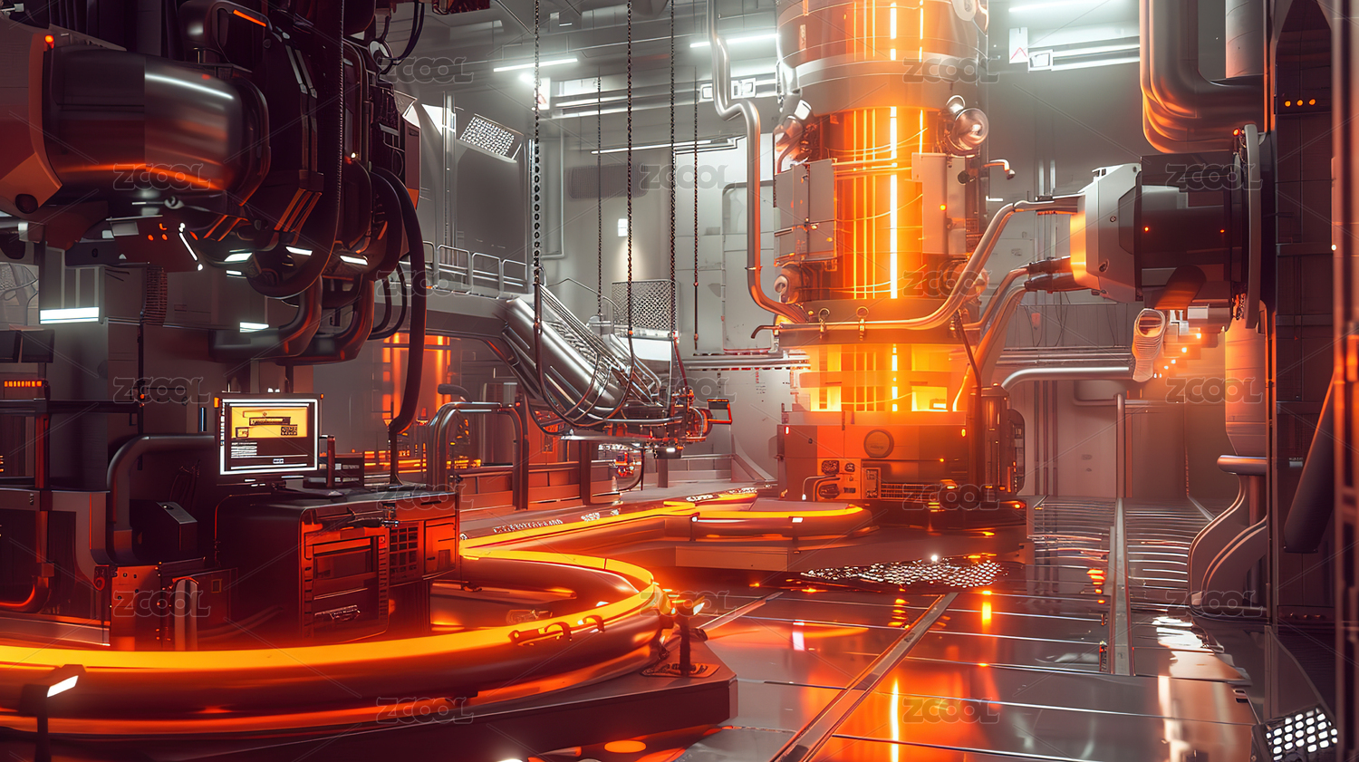 未来科技,高科技,先进科技,机械装置,科技实验室,蓝色光效,橙色部件,金属结构,工业设计,精密设备