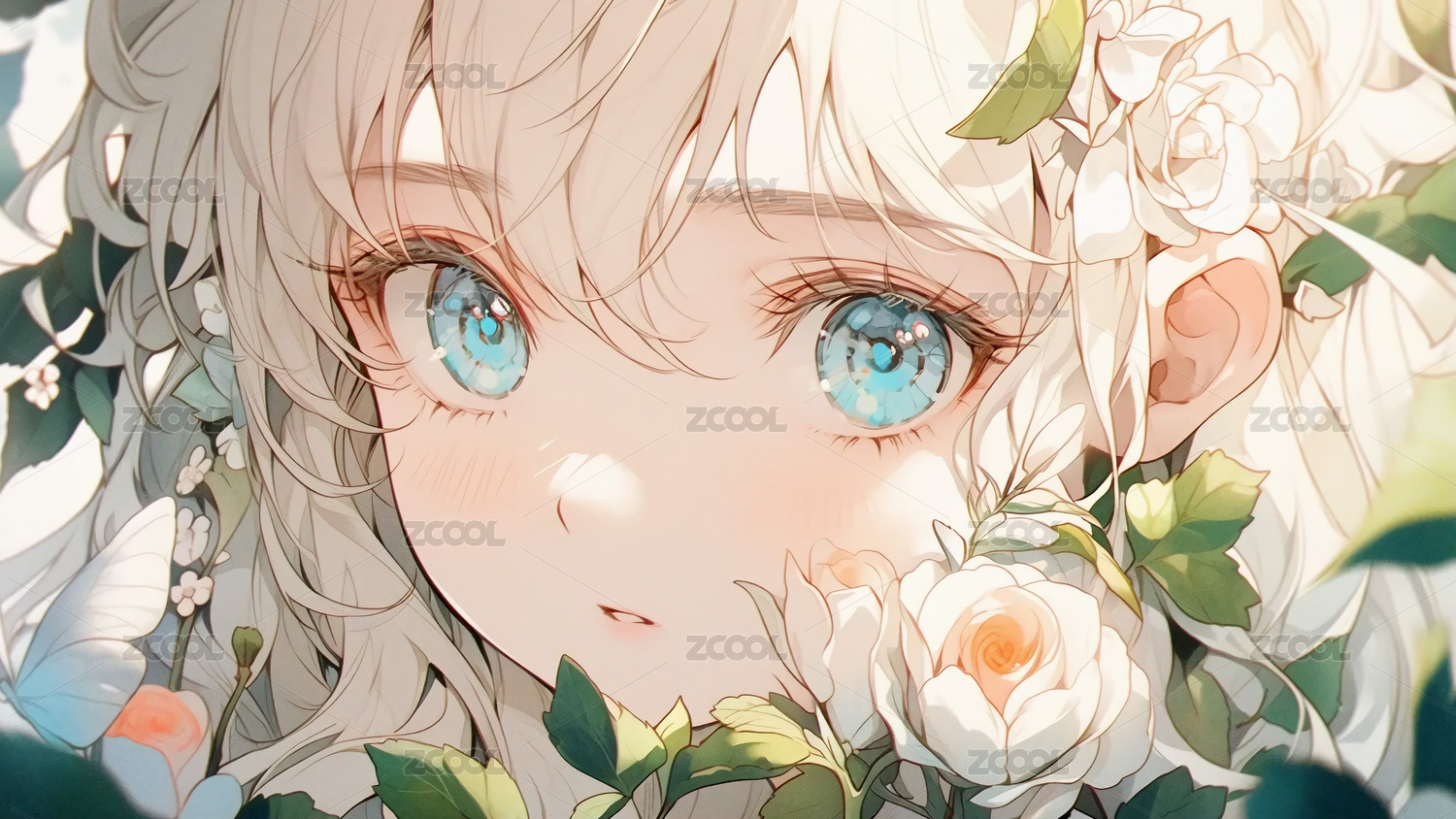 少女,眼睛,花卉,插画,唯美,动漫,女孩,花