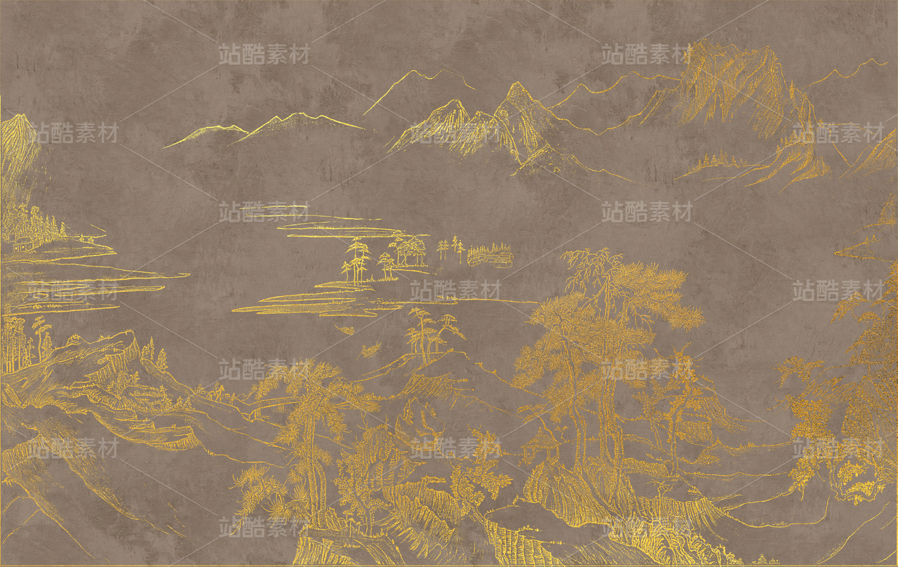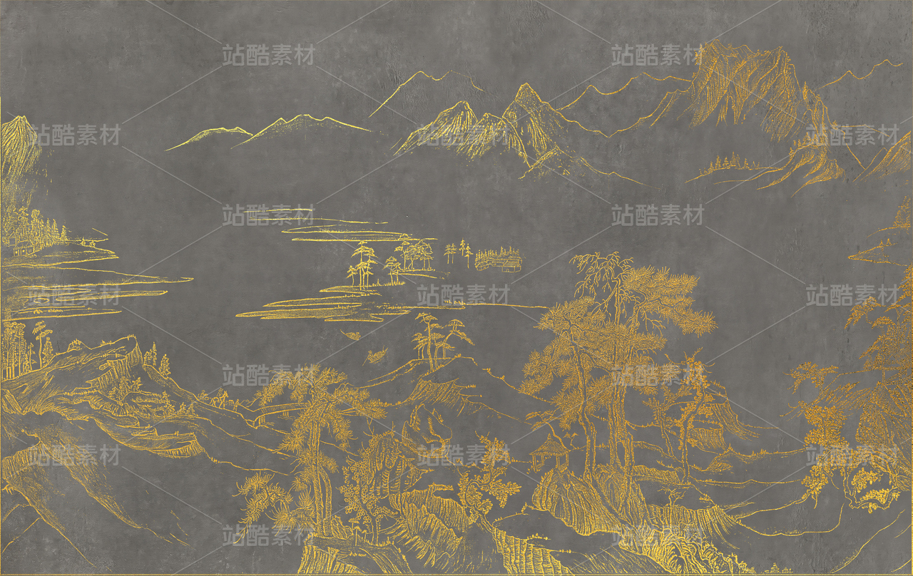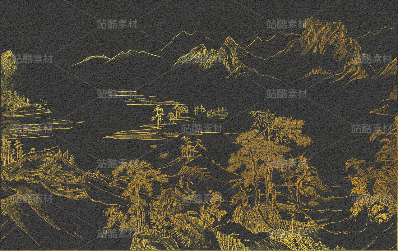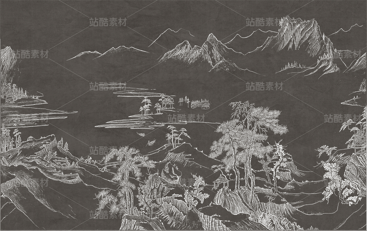 新款高清新款深灰水泥亭台楼阁新中式山水工装背景墙04