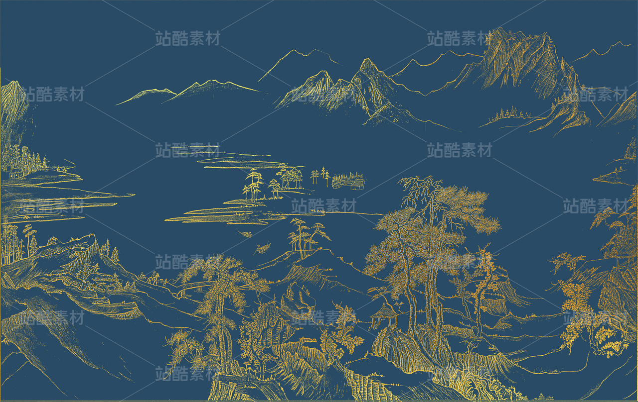 新中式国风亭台楼阁建筑工装背景墙壁画
