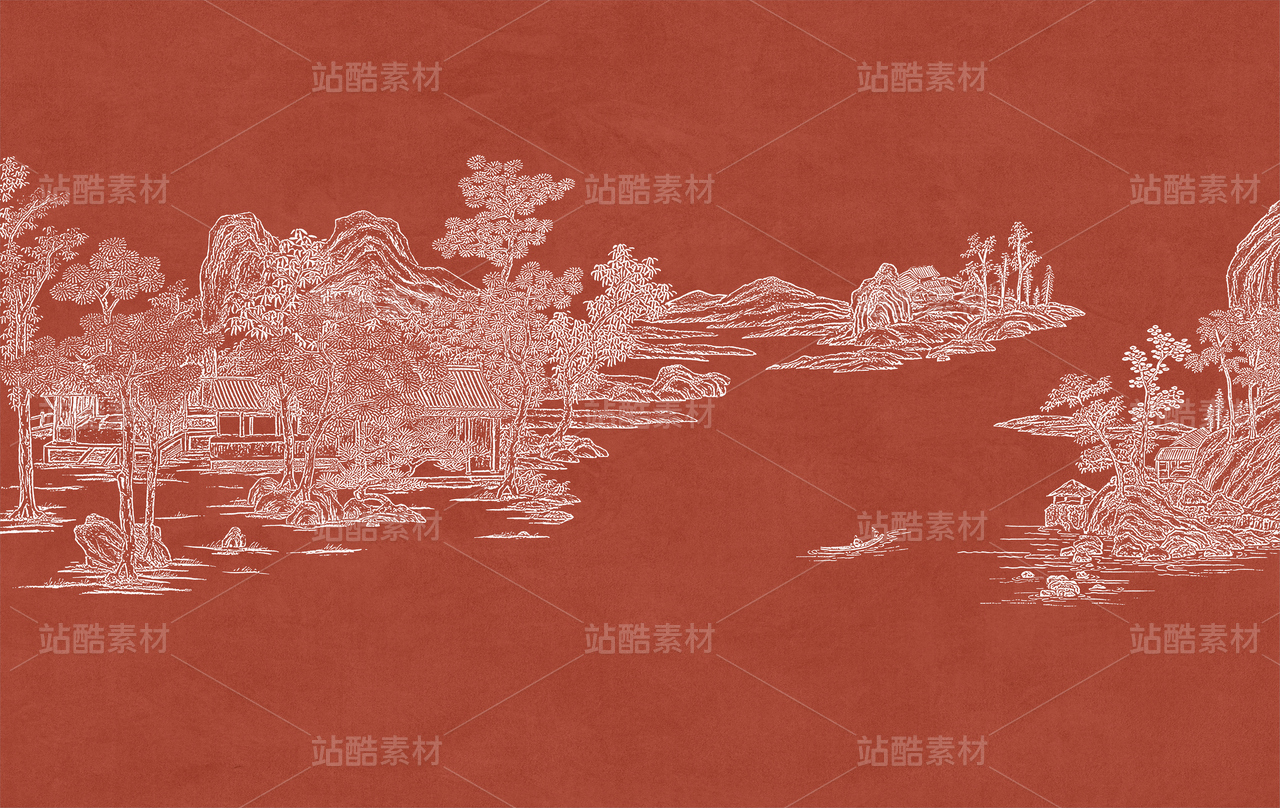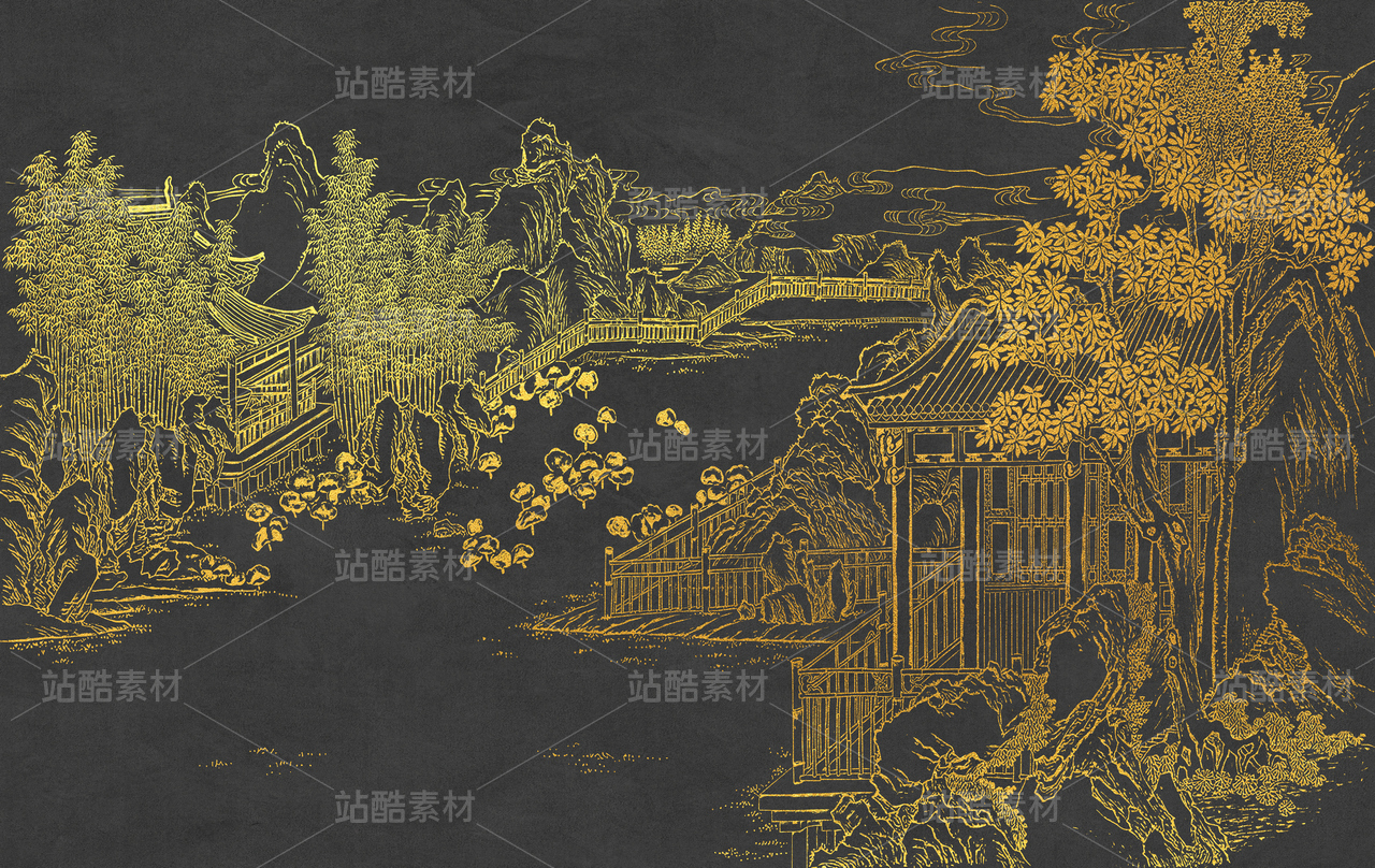 新中式国风亭台楼阁建筑工装背景墙壁画