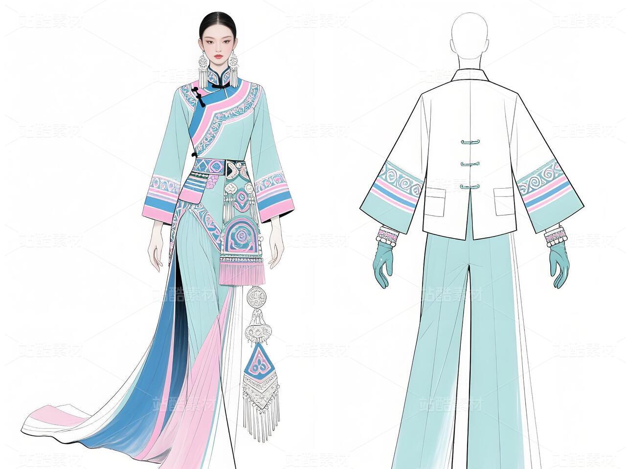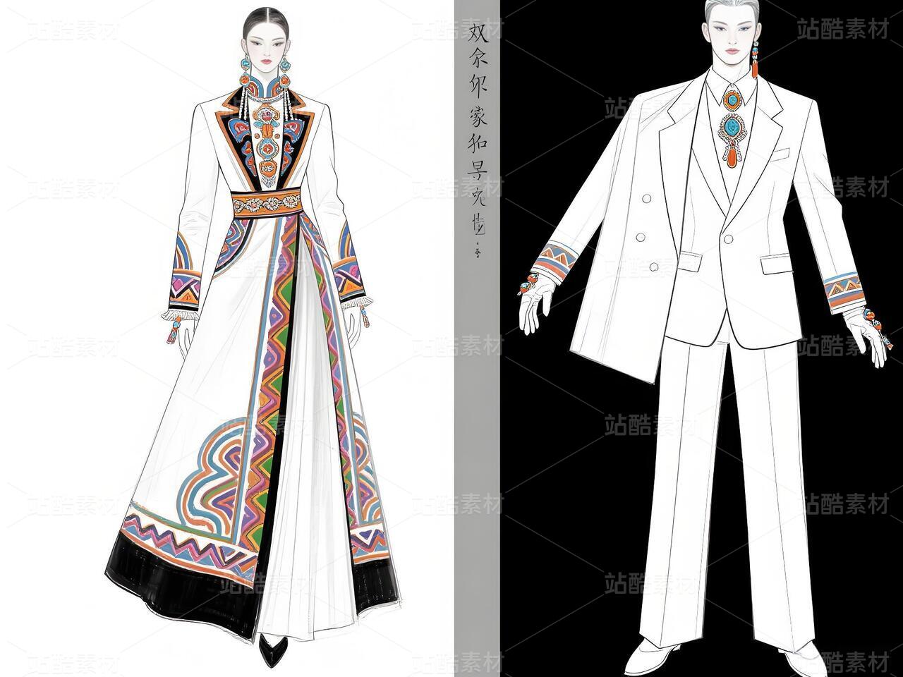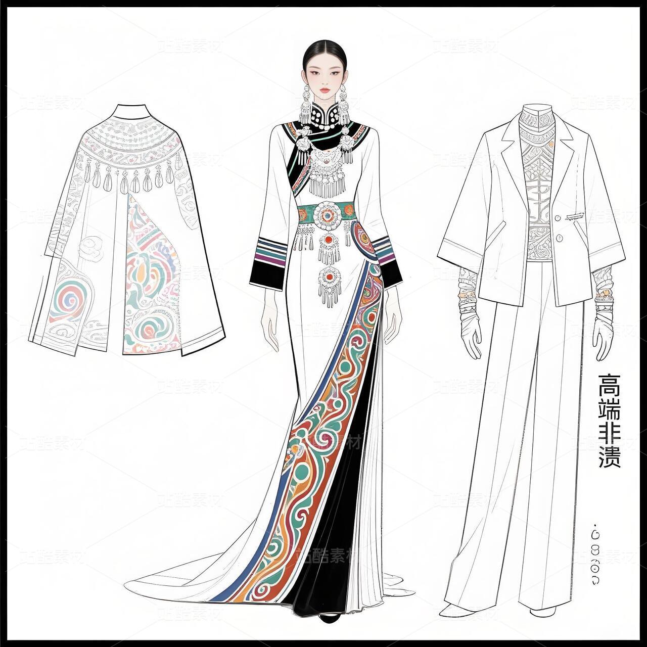 本系列以「宇宙壮歌」为概念,将壮锦太阳纹通过激光切割技术转化为机甲感镂空纹理。女装采用导电纤维与银丝壮锦混织的发光斗篷,男装以液态金属涂层面料打造仿生铠甲套装。手套与靴子内置微电路,使壮锦图案可随体温变化产生虹彩光效。配饰采用陨石银与全息箔片制成的层叠颈环,传统银匠工艺与3D打印结合,在时装中构建出穿越时空的文明对话。
