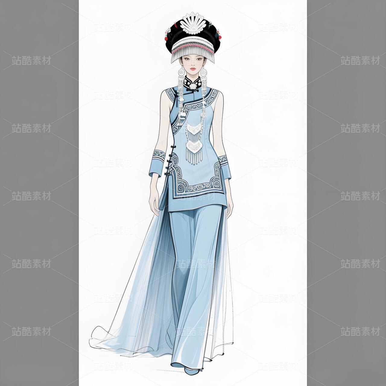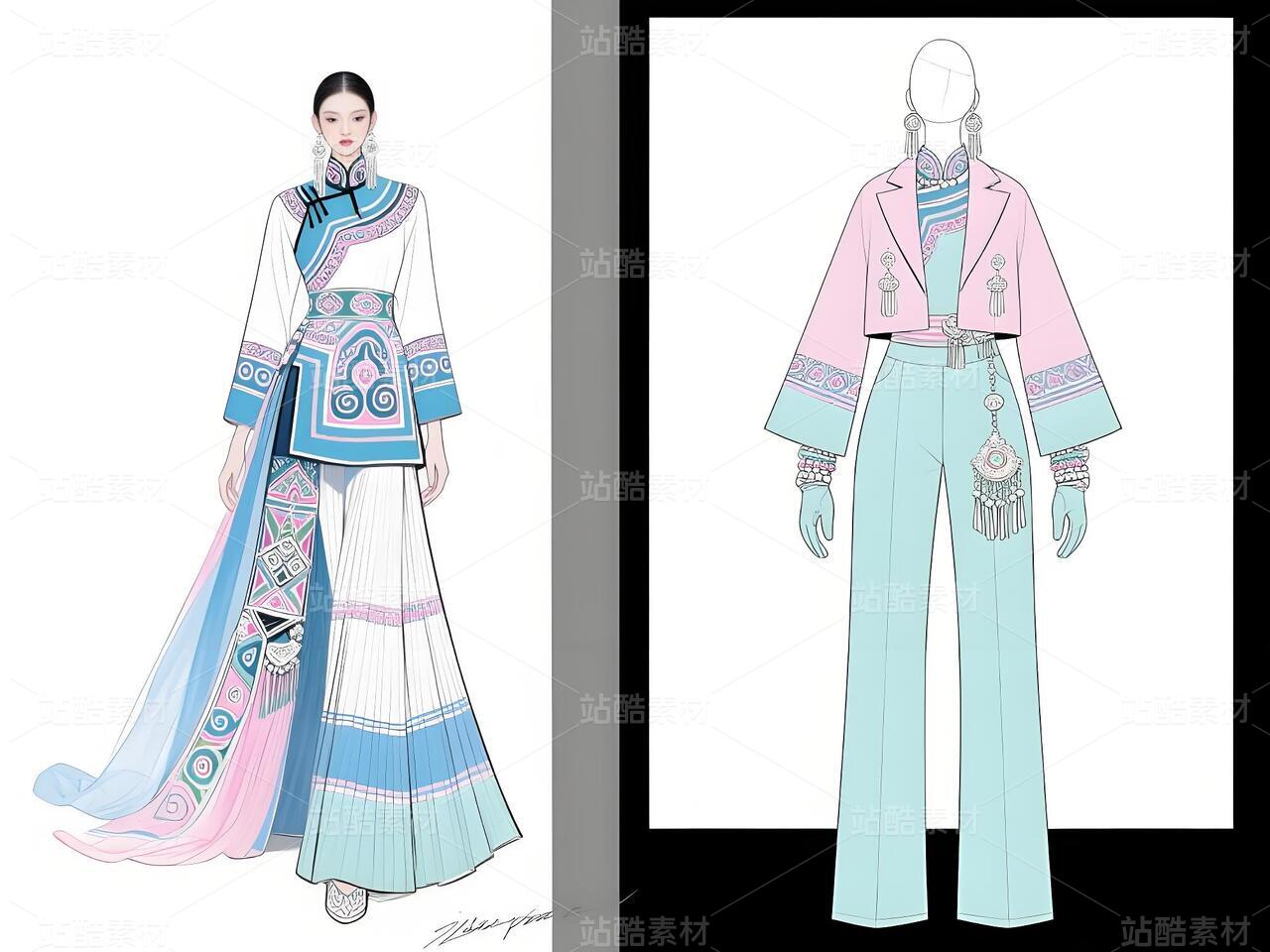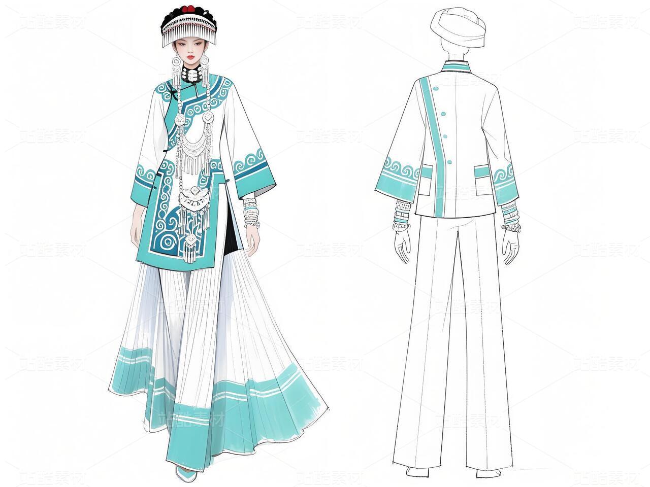 本系列以「宇宙壮歌」为概念,将壮锦太阳纹通过激光切割技术转化为机甲感镂空纹理。女装采用导电纤维与银丝壮锦混织的发光斗篷,男装以液态金属涂层面料打造仿生铠甲套装。手套与靴子内置微电路,使壮锦图案可随体温变化产生虹彩光效。配饰采用陨石银与全息箔片制成的层叠颈环,传统银匠工艺与3D打印结合,在时装中构建出穿越时空的文明对话。