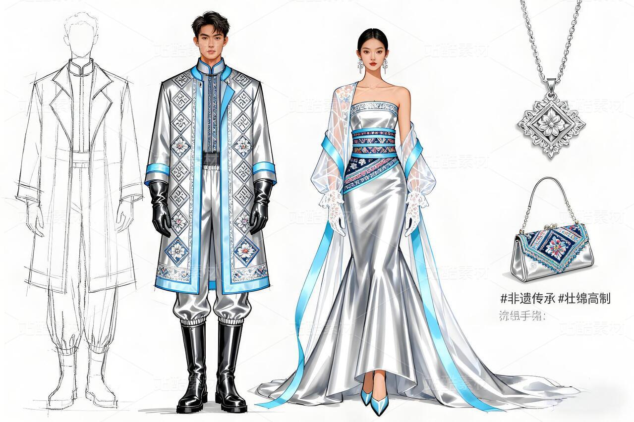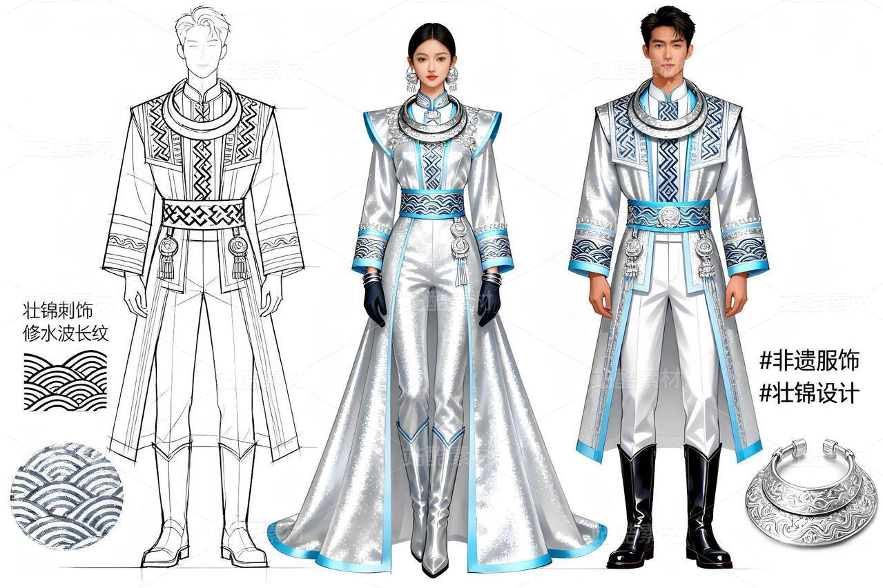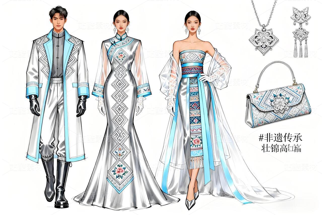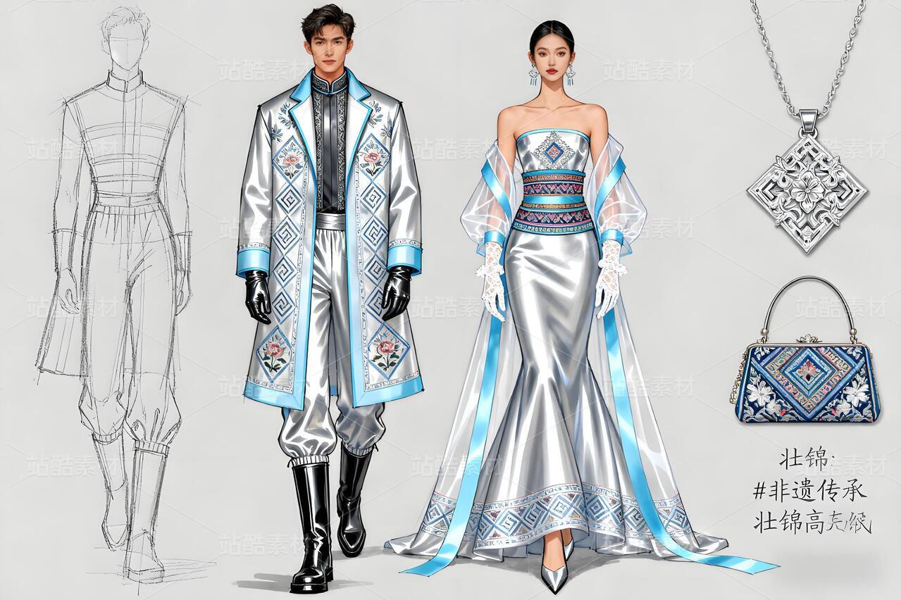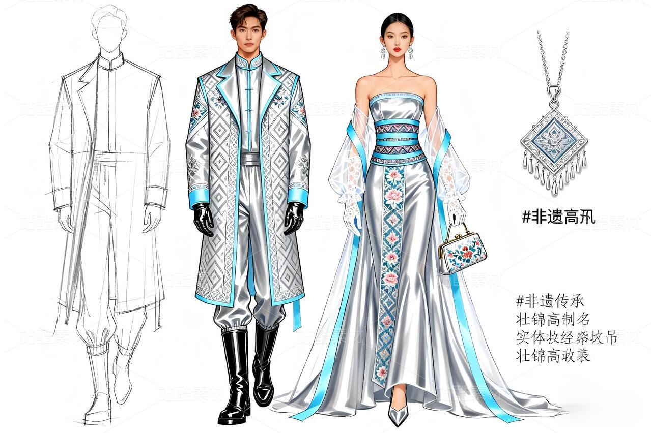 本系列以「宇宙壮歌」为概念,将壮锦太阳纹通过激光切割技术转化为机甲感镂空纹理。女装采用导电纤维与银丝壮锦混织的发光斗篷,男装以液态金属涂层面料打造仿生铠甲套装。手套与靴子内置微电路,使壮锦图案可随体温变化产生虹彩光效。配饰采用陨石银与全息箔片制成的层叠颈环,传统银匠工艺与3D打印结合,在时装中构建出穿越时空的文明对话。