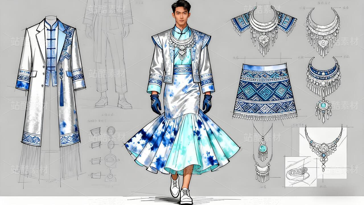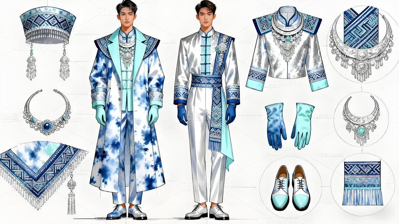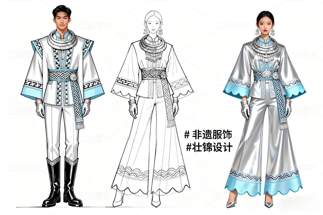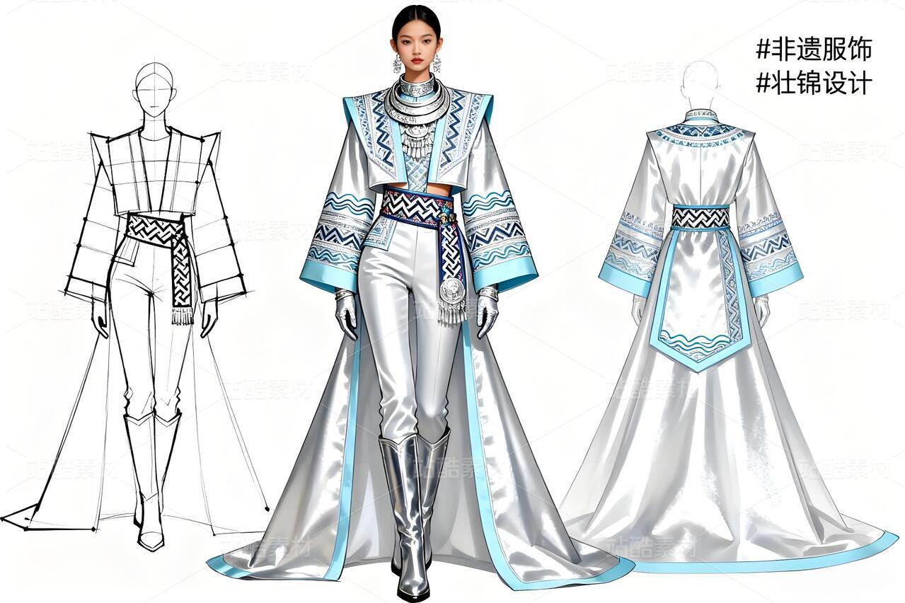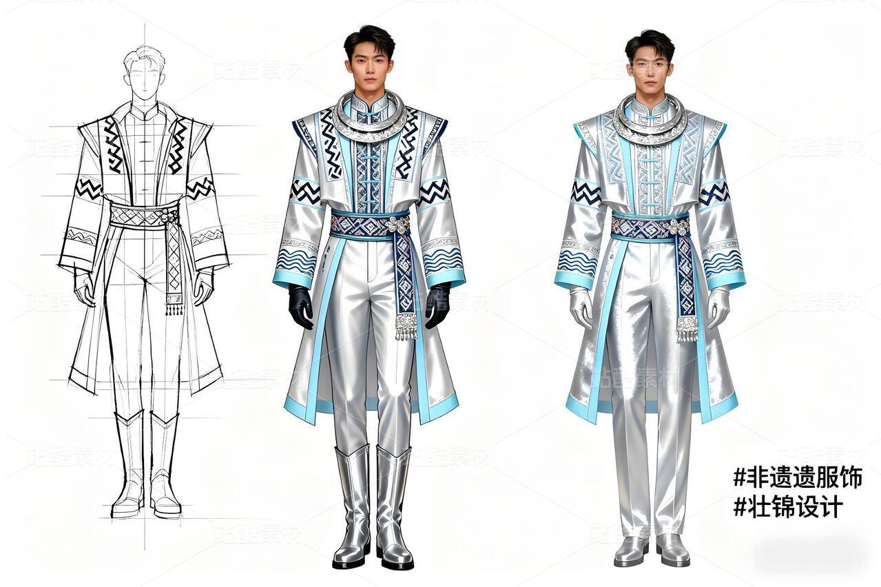 本系列以「宇宙壮歌」为概念,将壮锦太阳纹通过激光切割技术转化为机甲感镂空纹理。女装采用导电纤维与银丝壮锦混织的发光斗篷,男装以液态金属涂层面料打造仿生铠甲套装。手套与靴子内置微电路,使壮锦图案可随体温变化产生虹彩光效。配饰采用陨石银与全息箔片制成的层叠颈环,传统银匠工艺与3D打印结合,在时装中构建出穿越时空的文明对话。