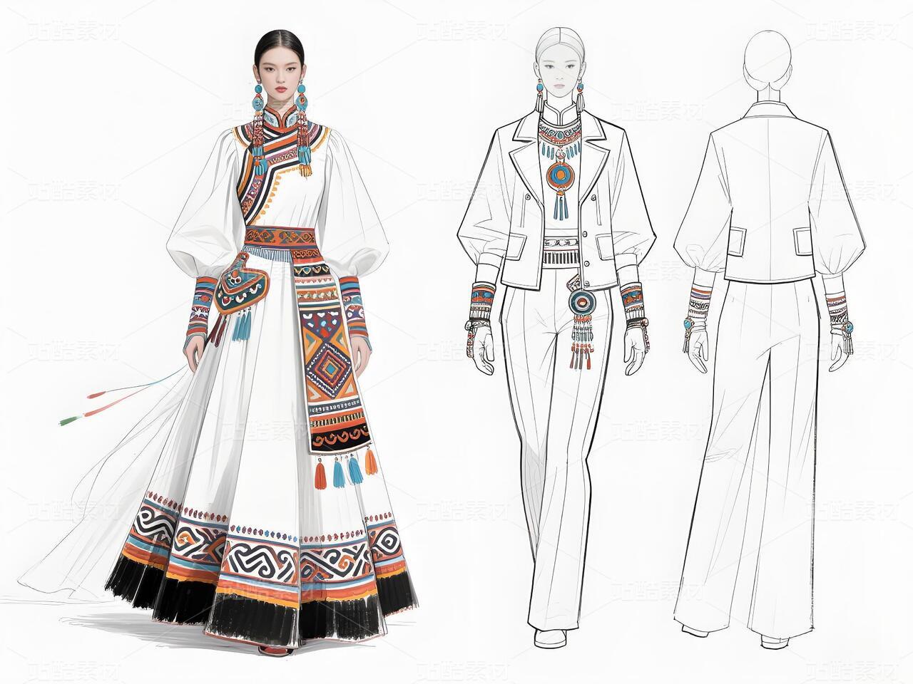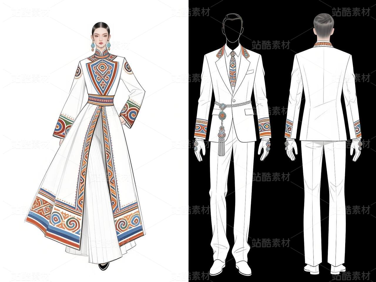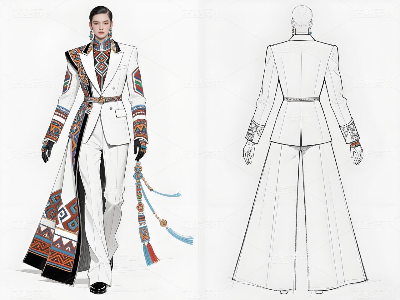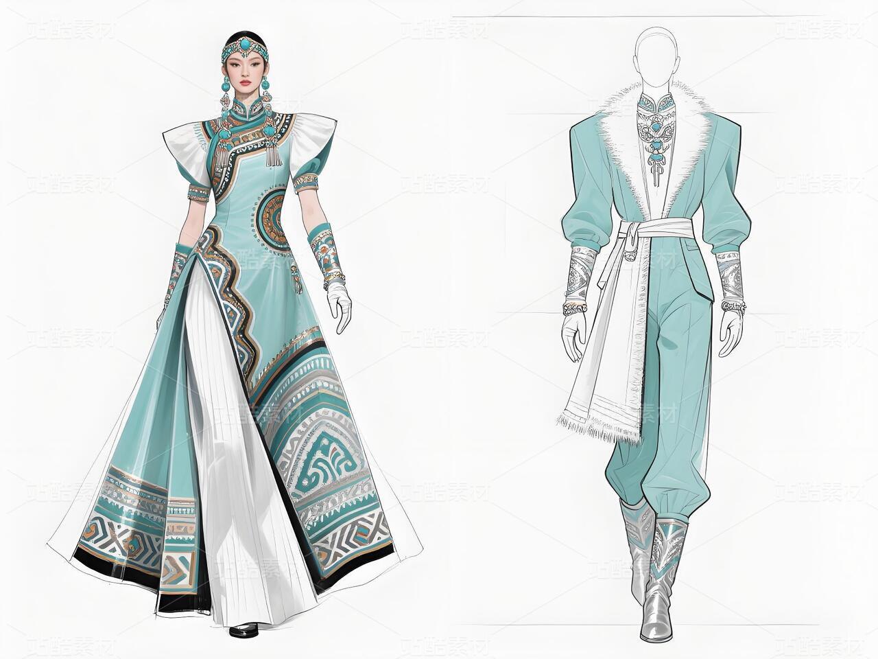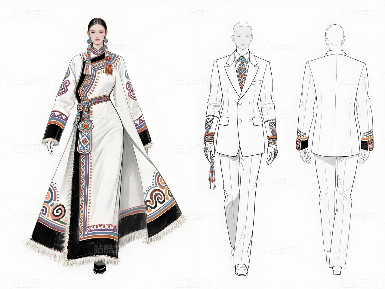 本系列以「宇宙壮歌」为概念,将壮锦太阳纹通过激光切割技术转化为机甲感镂空纹理。女装采用导电纤维与银丝壮锦混织的发光斗篷,男装以液态金属涂层面料打造仿生铠甲套装。手套与靴子内置微电路,使壮锦图案可随体温变化产生虹彩光效。配饰采用陨石银与全息箔片制成的层叠颈环,传统银匠工艺与3D打印结合,在时装中构建出穿越时空的文明对话。