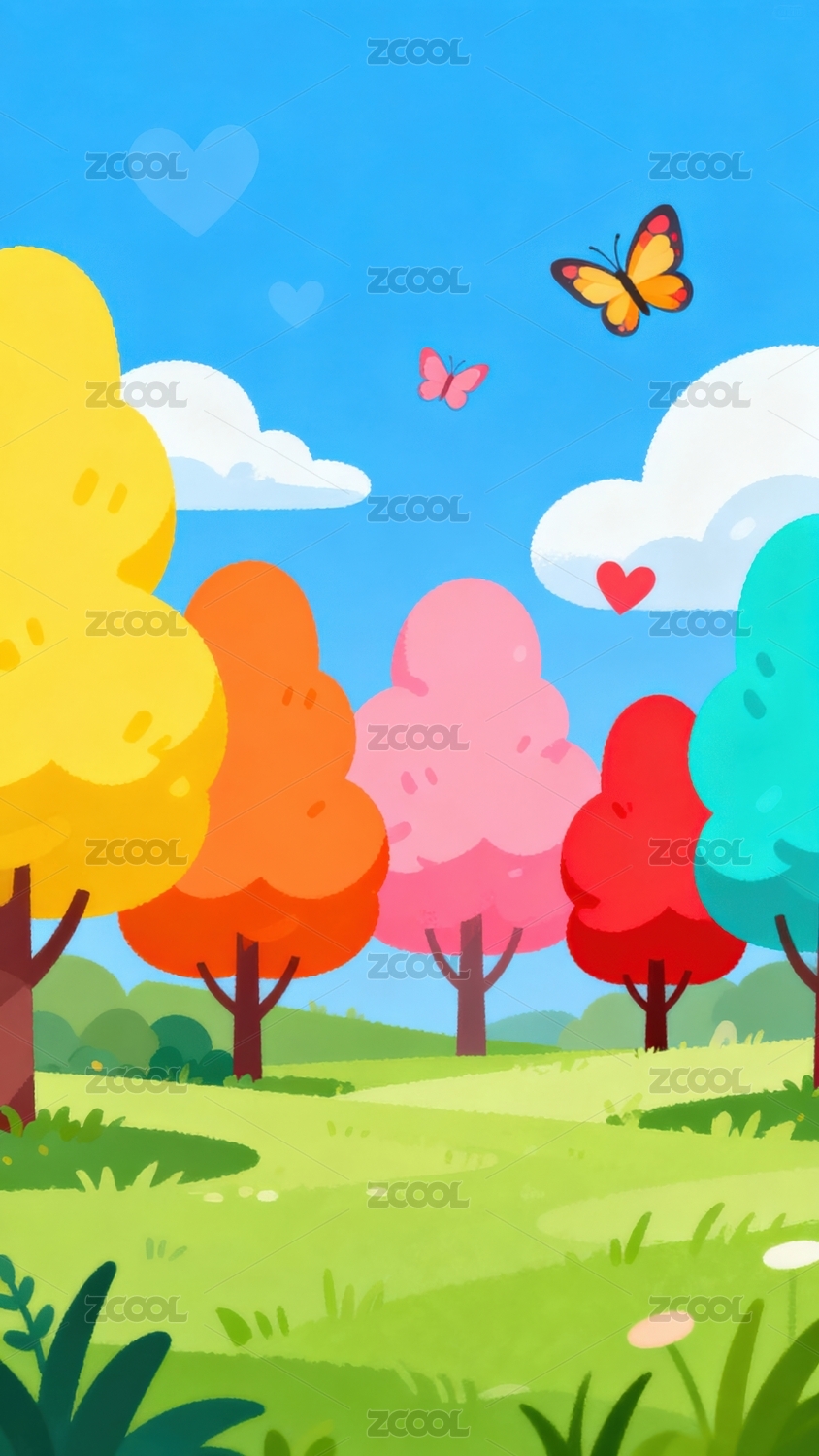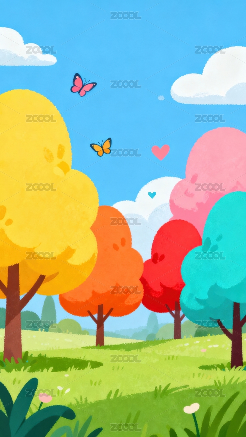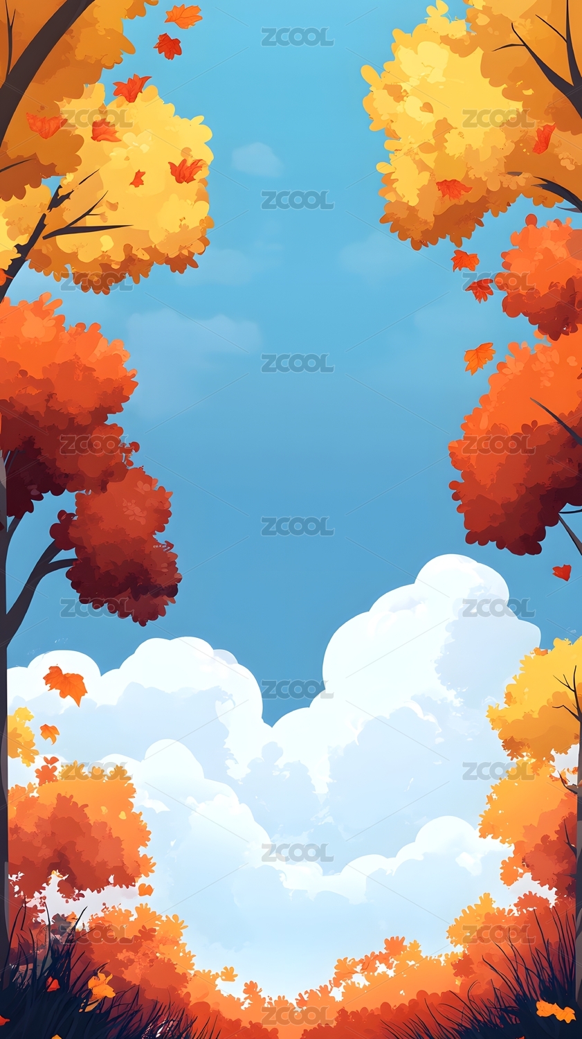 秋天扁平插画蓝天白云树木落叶壁纸竖版